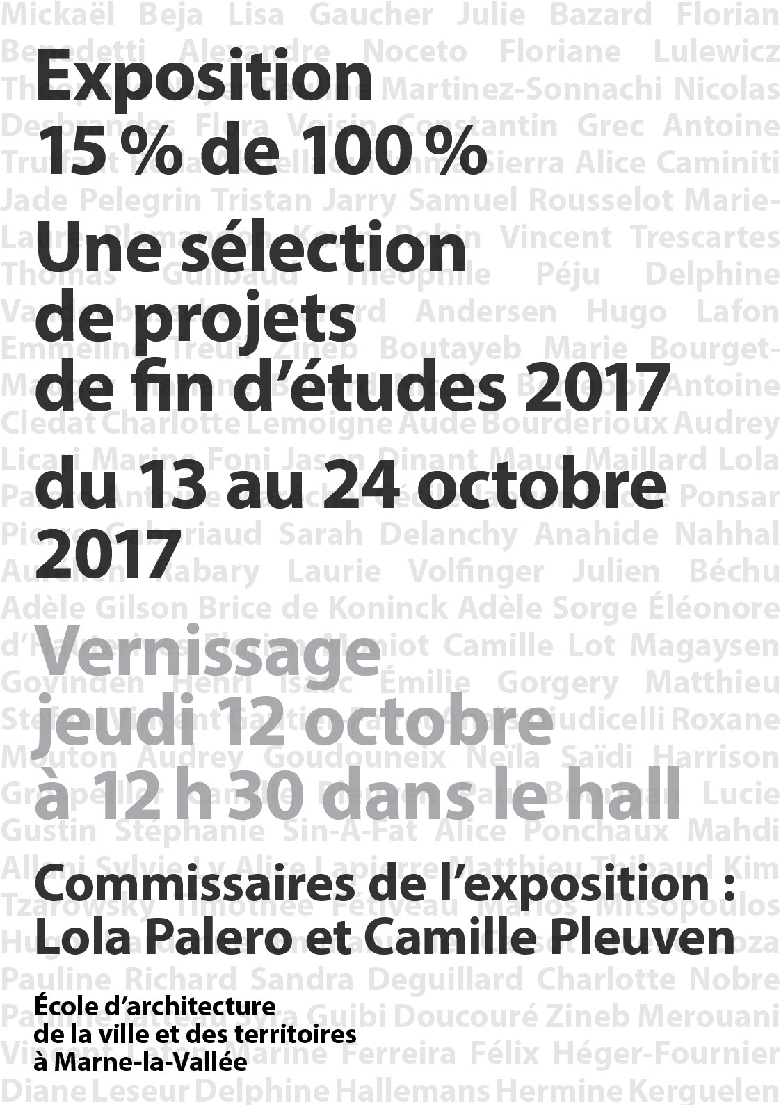 Vernissage de l’exposition 15 % de 100 % présentant une sélection de projets de fin d'études 2017.