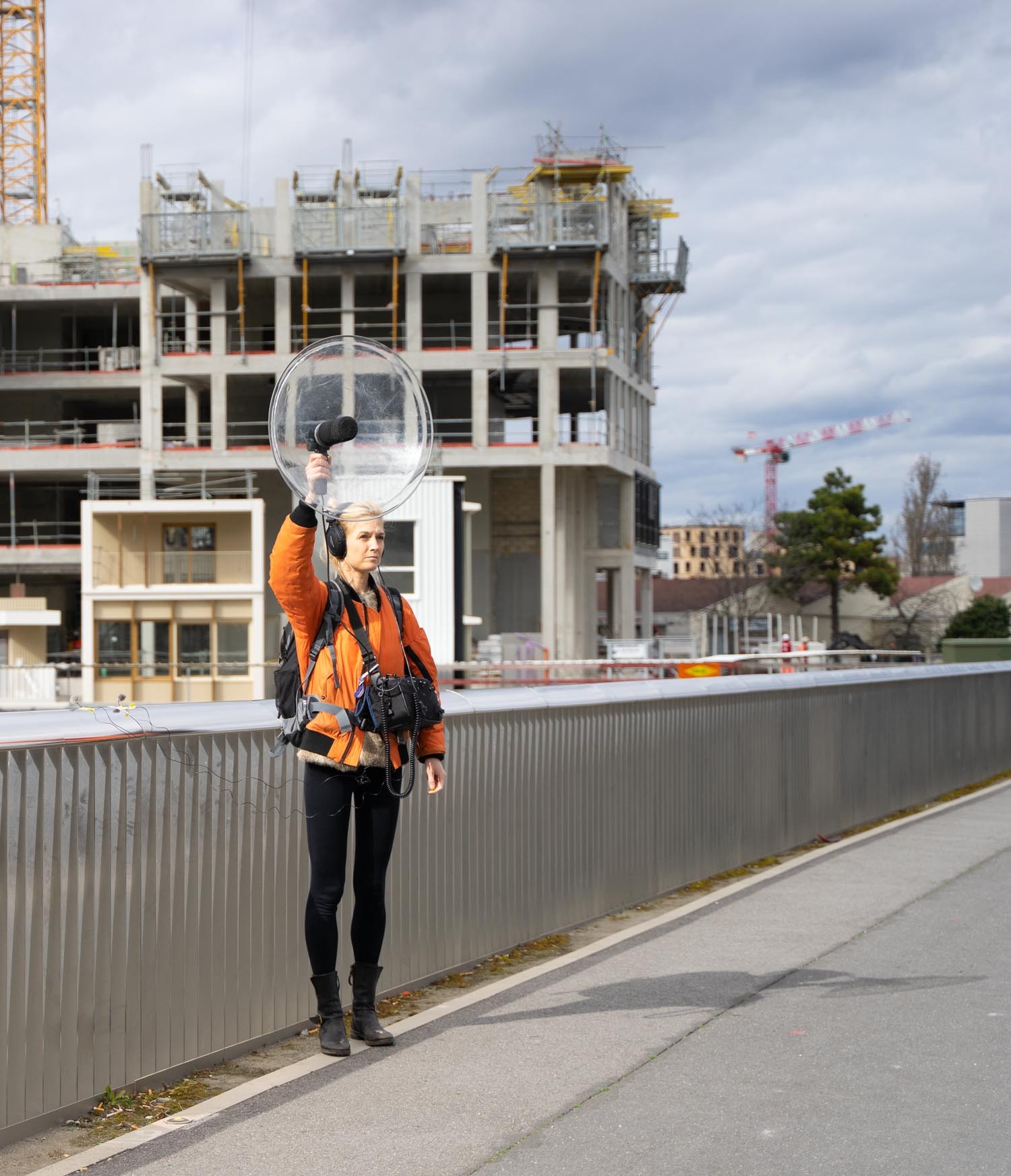 Nadine Schütz réalise des enregistrements sonores d’ambiances de chantier dans le quartier des Groues à Nanterre pour l'œuvre « Chanterre » (Installation sonore multicanale 4.1, durée variable, création 2023, commande : La Ville de Nanterre – Direction du Développement Culturel)