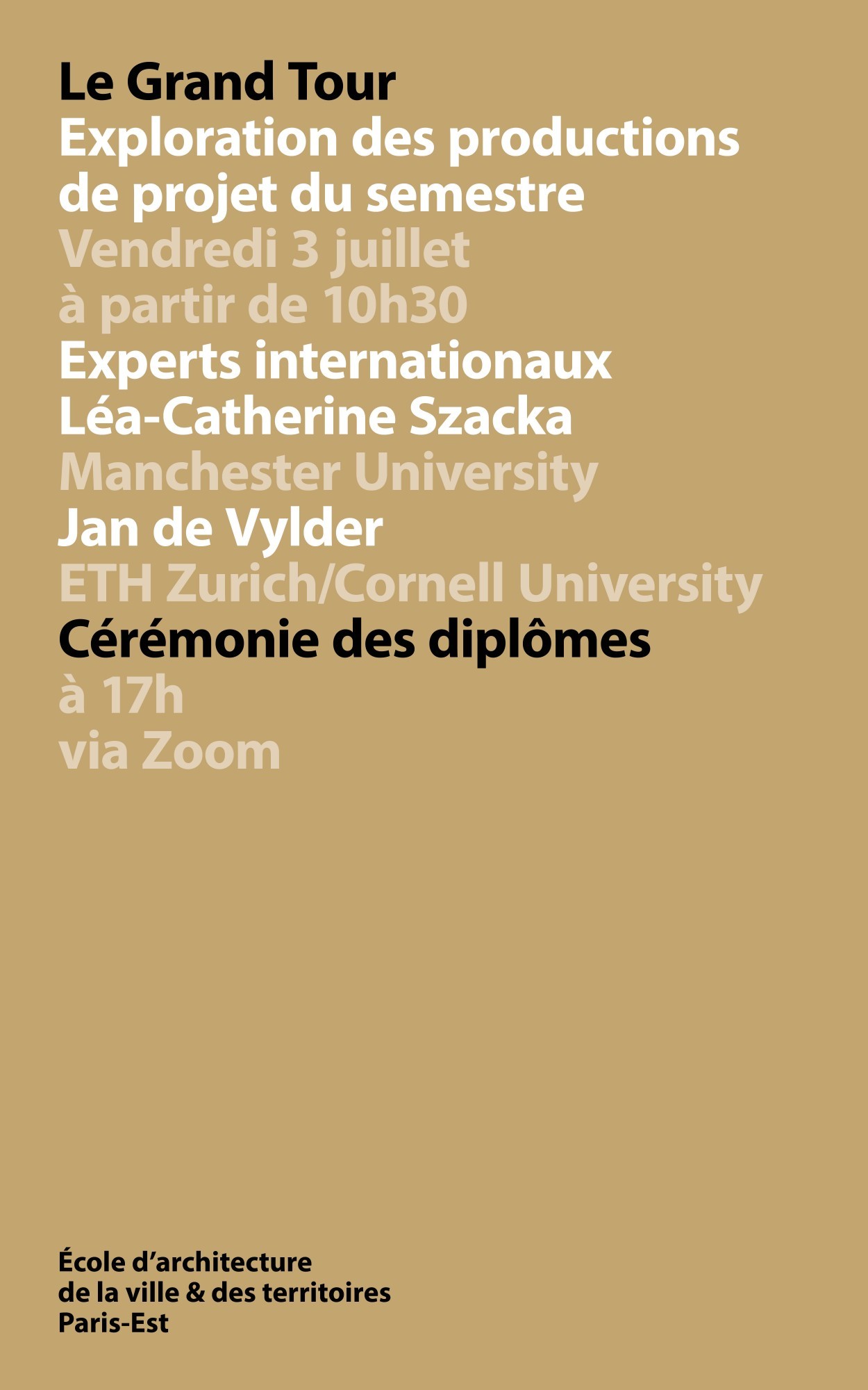 Un peu plus tôt dans la journée, de 10h30 à 13h, nous organisons un « Grand tour » virtuel des travaux de projets produits durant le semestre qui vient de s’achever, en présence de nos deux experts internationaux : Léa-Catherine Szacka, Manchester University et Jan de Vylder, ETH Zurich/Cornell University.