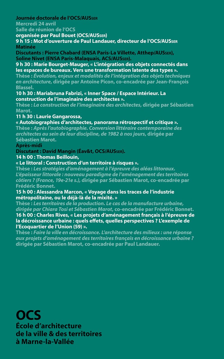 Dans le cadre du "Mois de la Recherche", l'Observatoire de la condition suburbaine (OCS), équipe de recherche de l'Éav&t, organise, sous la coordination de Paul Bouet, une journée doctorale, le mercredi 24 avril prochain, au cours de laquelle six doctorants présenteront un aspect particulier de leur thèse en cours et en débattront avec des chercheurs de l’École et de laboratoires partenaires. Une journée qui s'annonce très intéressante et riche d'échanges et à laquelle il est libre d'assister dans la limite des places assises disponibles de la salle.