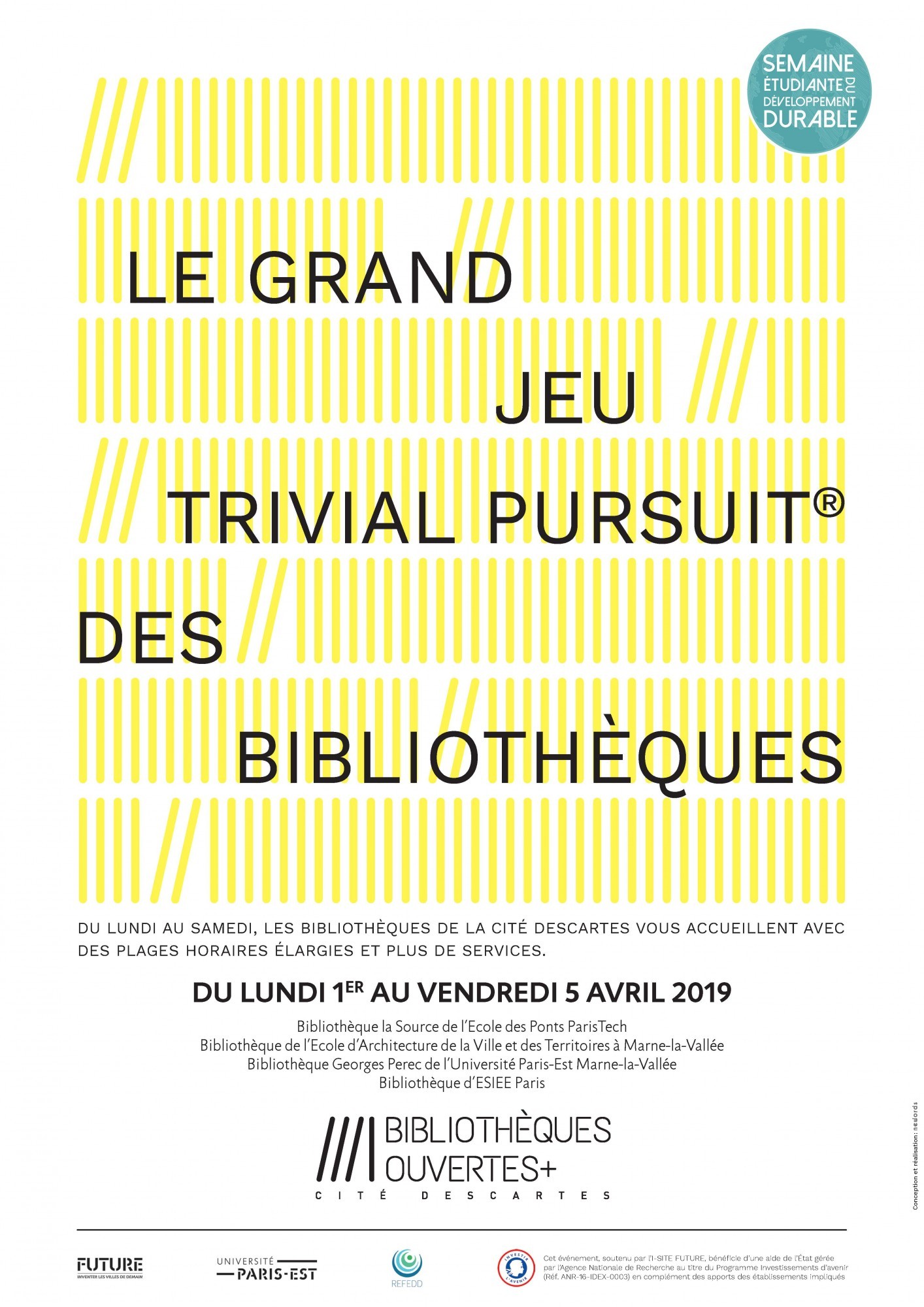 À l’occasion de la Semaine Étudiante du Développement Durable, les bibliothèques de la Cité Descartes (ESIEE, UPEM, ENPC, ÉAV&T) vous ouvrent leurs portes pour un Trivial Pursuit, du lundi 1er au vendredi 5 avril 2019. Par équipes de 3 ou 4 personnes, les participants pourront se mesurer aux questions sur le développement durable et tenter de remporter l’un des lots mis en jeu ! Au travers de cette activité intellectuelle et ludique, les participants sont invités à découvrir les services et espaces proposés par les bibliothèques sur la Cité Descartes, notamment en soirée.