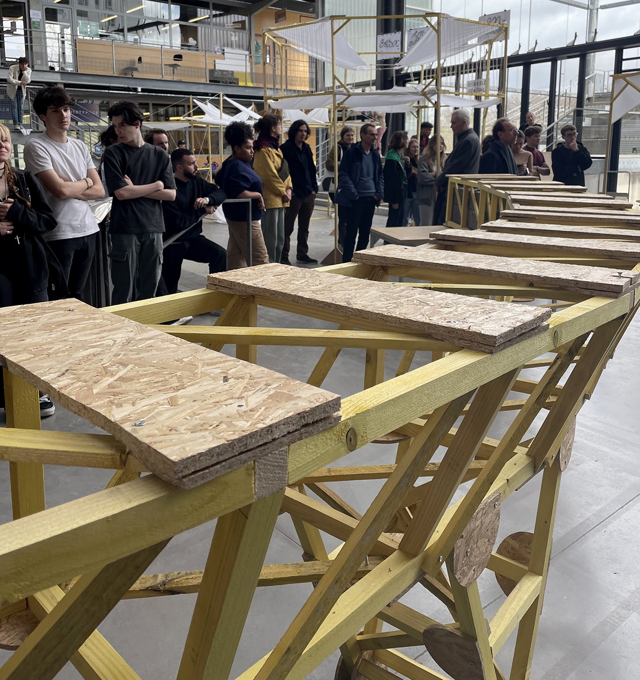 Thème D : Passerelles en carton. Réalisation d'une passerelle portant sur 6 mètres à l’échelle 1, capable de supporter successivement le passage du jury et de tous les membres de l’équipe conceptrice.