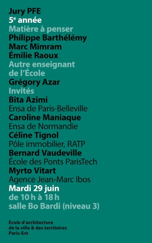 à 10:00Salle Bo BardiEnseignants : Philippe Barthélémy Emilie Raoux Marc Mimram Autre enseignant de l'École : Grégory Azar Invités : Bita Azimi, Ensa…