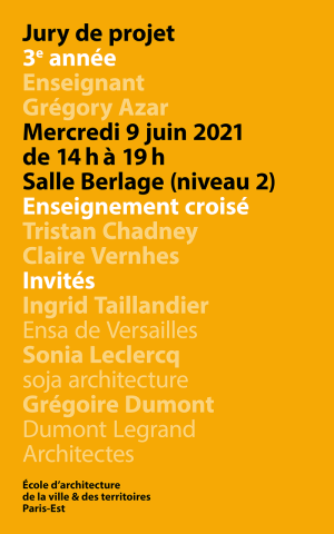 Enseignant Grégory Azar Enseignement croisé Tristan Chadney Claire Vernhes Invités Ingrid Taillandier, Ensa de Versailles Sonia Leclercq,…