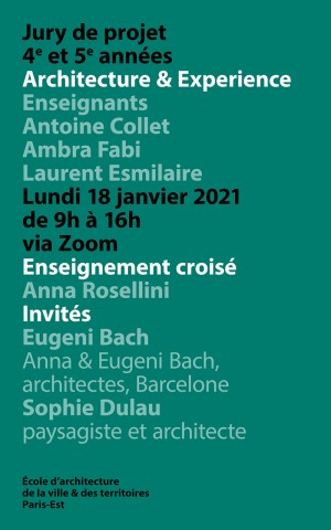 à 09:00ZoomArchitecture & Experience Antoine Collet Ambra Fabi Laurent Esmilaire Enseignement croisé Anna Rosellini Invités Eugeni Bach Anna &…