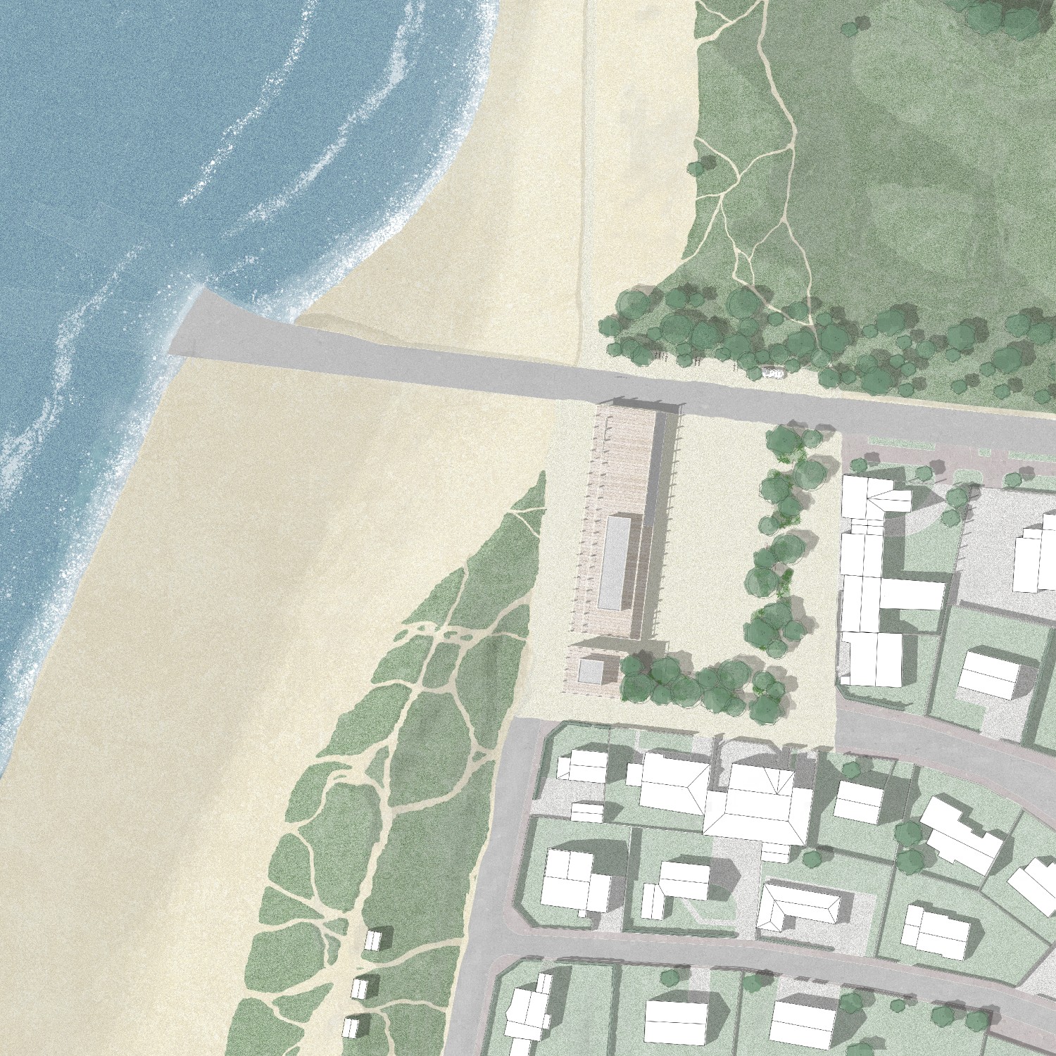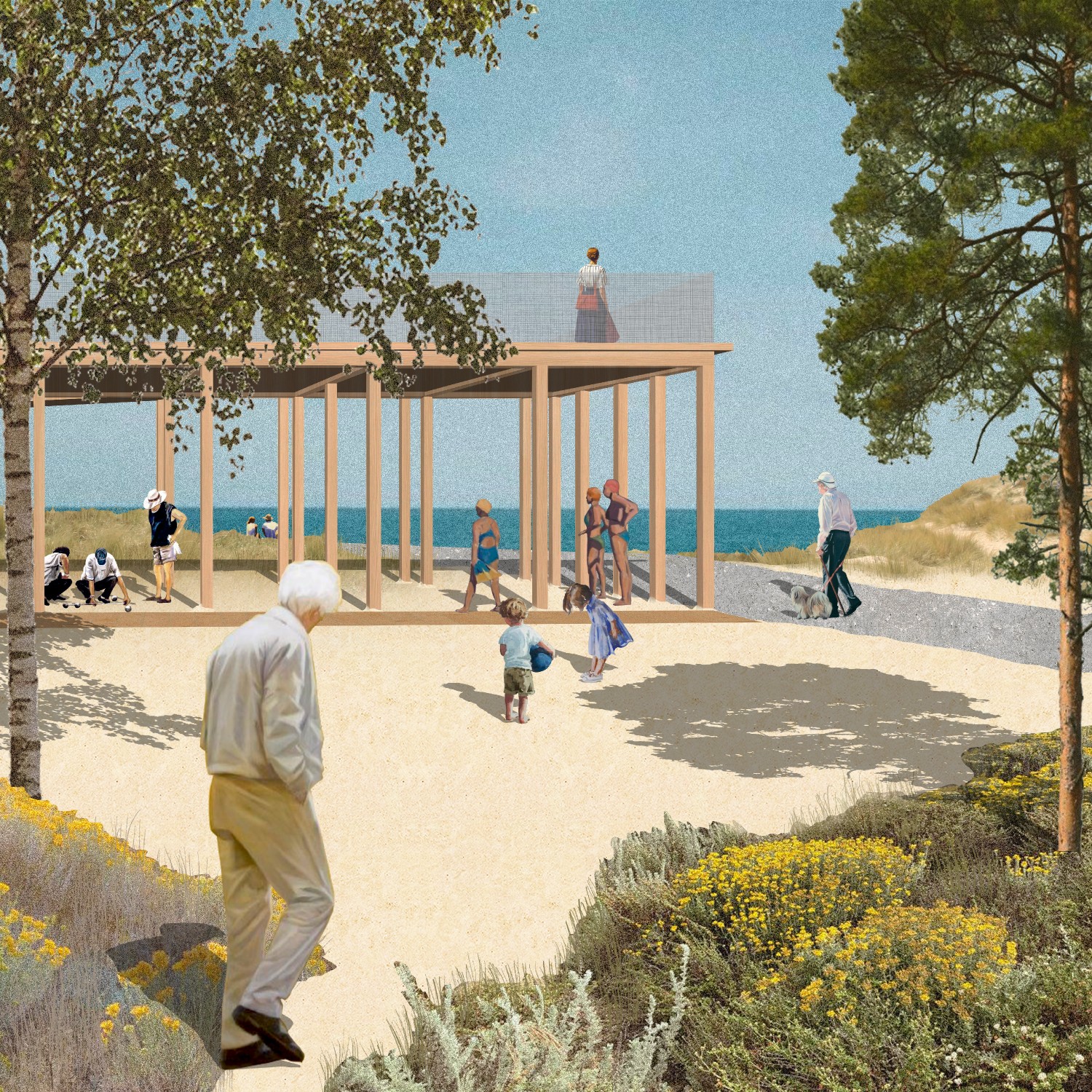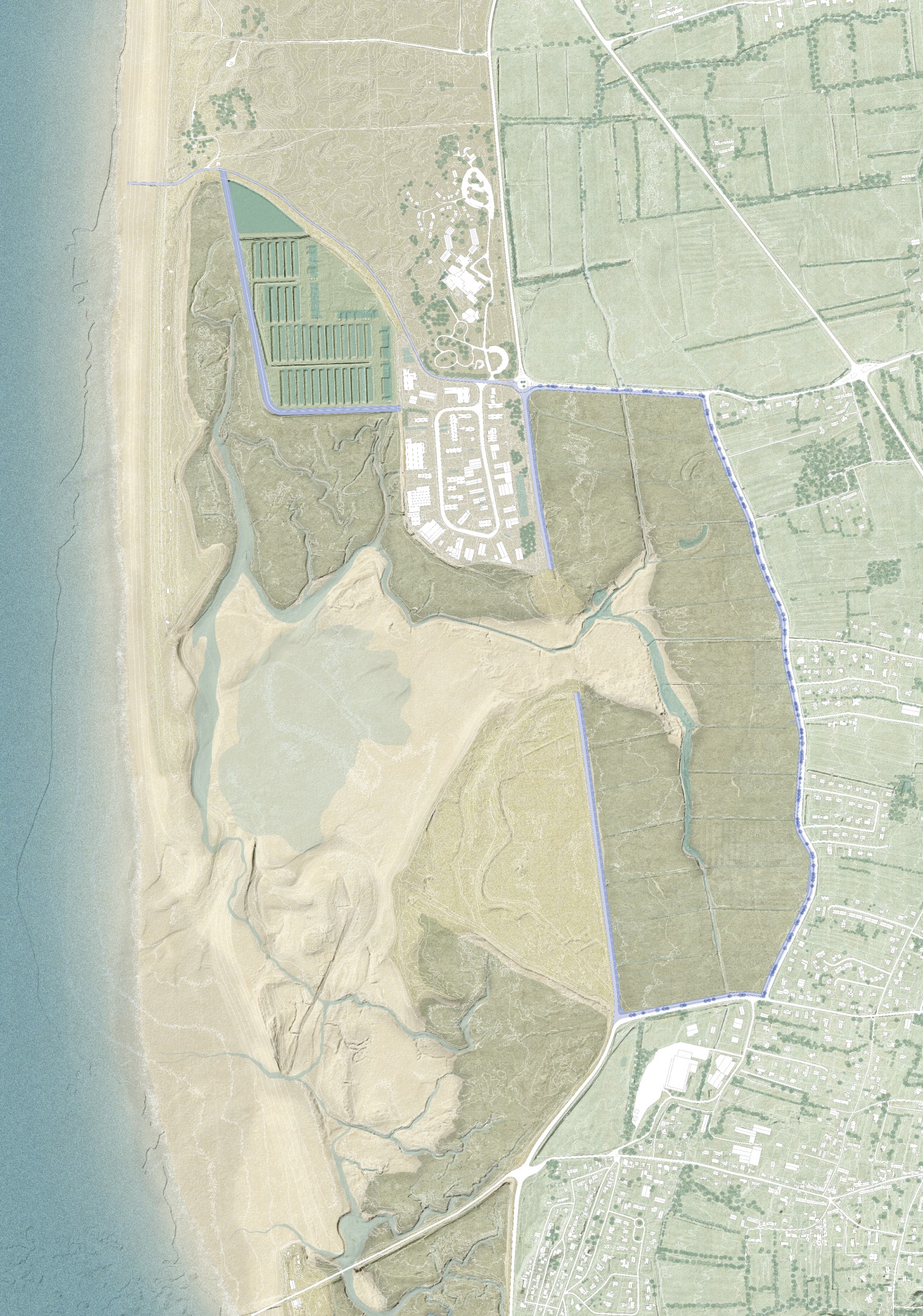 Fondées durant la période médiévale, Gouville-sur-Mer et Blainville-sur-Mer s’implantent sur les hauteurs, la mer étant perçue comme un danger et une ressource. C’est ainsi que s’établissent transversalement les activités humaines. À l’après-guerre, ce rapport s’inverse : la dune est urbanisée au profit du tourisme et de la production. Aujourd’hui, l’accentuation de phénomènes naturels fait resurgir la conscience du risque, remettant en question la pérennité des installations du bord de mer. Les ajustements proposés sur le littoral coutançais sont autant d’occasions de restaurer un lien entre touristes et habitants, faciliter les liaisons mer-bocage, ou encore conforter les singularités géographiques et paysagères du territoire.