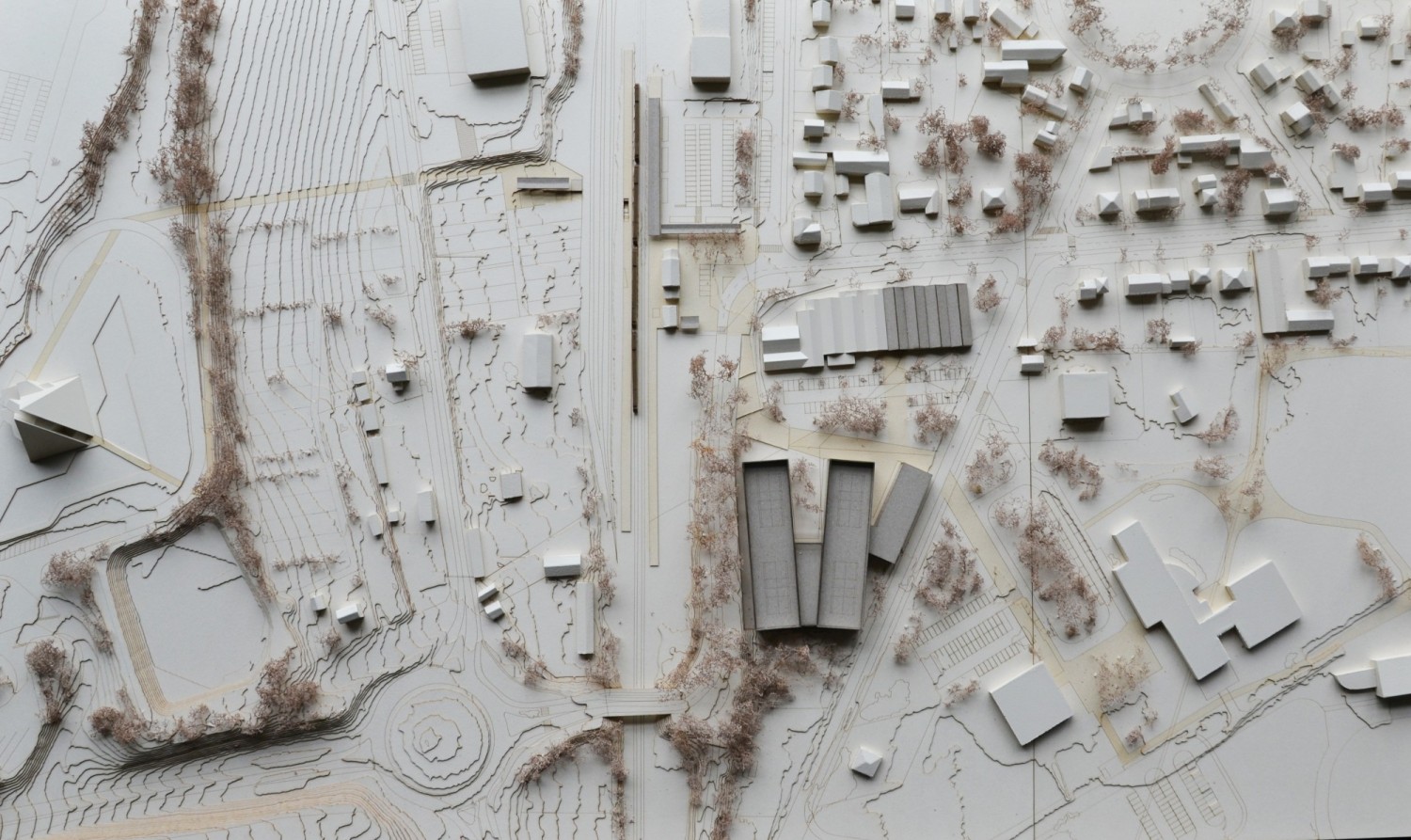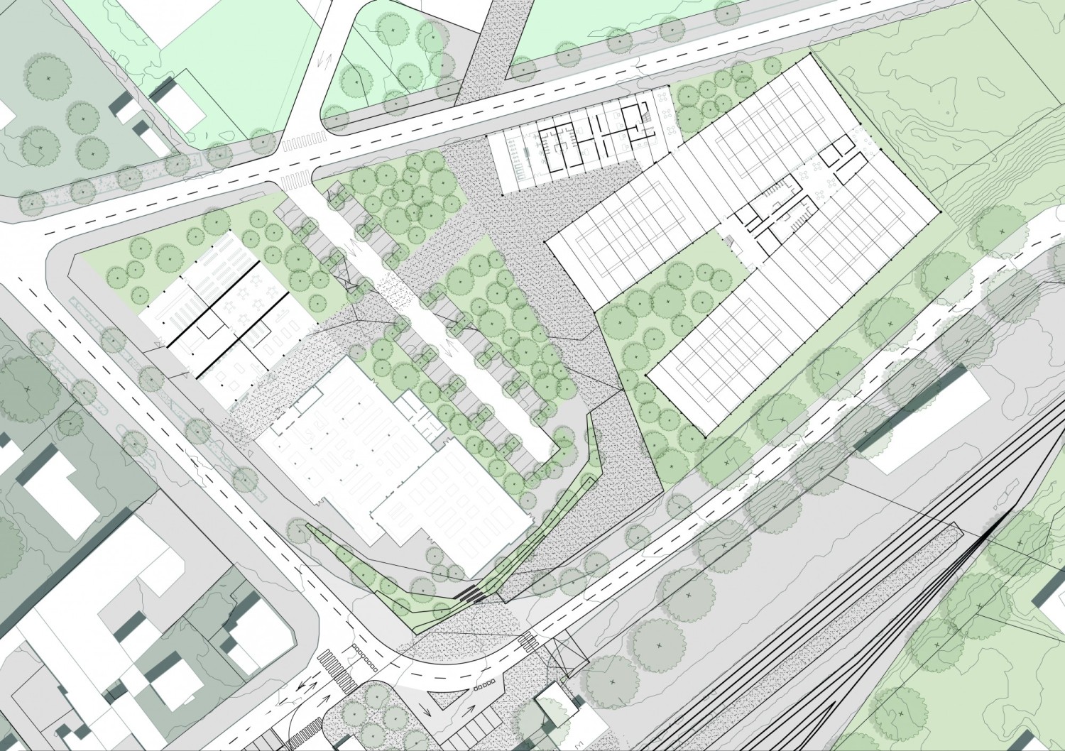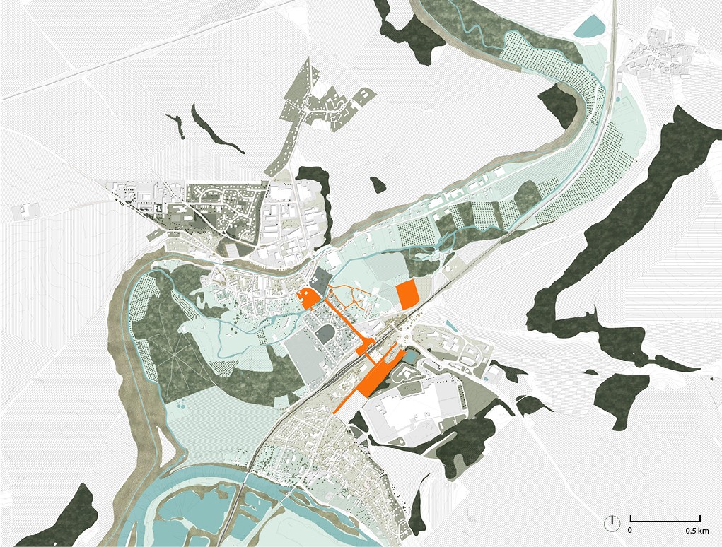 Quiconque traverse Lizy-sur-Ourcq, Mary-sur-Marne ou Ocquerre ne peut échapper au dialogue entre la vallée de l’Ourcq et la pyramide de l’imprimerie Didier Mary. Cette figure rappelle la période prospère des années 1990, loin de la situation actuelle des trois communes. Les symptômes de ce territoire aujourd’hui fragilisé sont connus : dévitalisation du centre-ville, paupérisation, chômage, perte d’emplois et d’attractivité économique. Au travers de cette étude, la Direction départementale de Seine-et-Marne prend en main le développement du territoire de l’intercommunalité, accompagné par la communauté de communes du Pays de l’Ourcq. L’objet de la commande souhaite retrouver la cohérence d’un territoire « péri-métropolitain », chahuté entre les logiques locales et celles du Grand Paris. Le rayonnement intercommunal prend son point de départ autour de la gare, à la croisée de toutes ces échelles territoriales. Comment un travail sur les accès et la cohabitation des modes de déplacement pourrait-il devenir vecteur d’une nouvelle cohérence territoriale depuis la gare ? Appréhender ce projet urbain à travers une complémentarité des circuits, équipements et paysages du quotidien permettrait-il de retrouver proximités et continuités dans la pratique locale du Pays de l’Ourcq ? En suivant le principe de ne pas « séparer la ville des lieux de celles des liens », six situations de projet tendent vers cet équilibre : resserrer les « liens » tout en renforçant les « lieux ». Redéfinir l’identité du lieu de la mobilité (la gare), tisser une continuité urbaine et paysagère (l’îlot « interface »), connecter et protéger l’économie locale (le site de l’imprimerie), retrouver le paysage de la vallée de l’Ourcq (la promenade du Plateau), dynamiser le centre-ville (fusion d’écoles et équipement culturel) : tels sont les objectifs pour favoriser les pratiques quotidiennes de ce territoire diffus.
