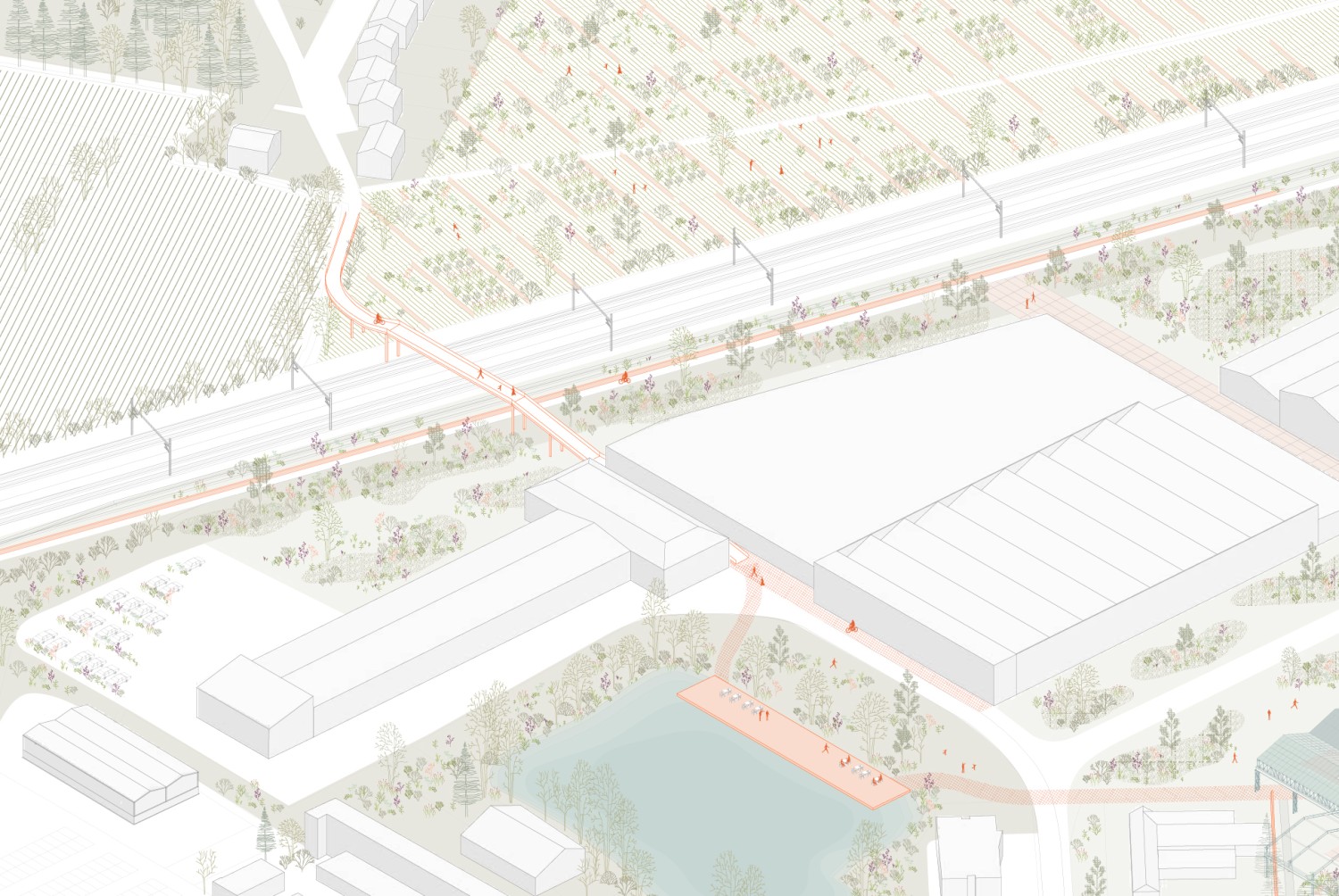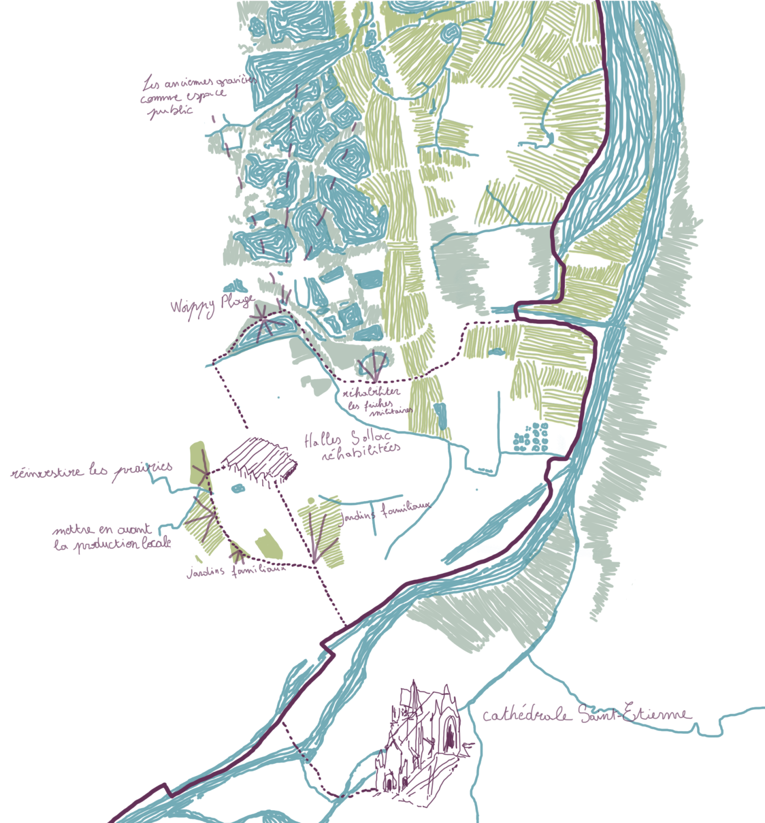 Cette étude porte sur le projet de réhabilitation de halles industrielles situées à Woippy, en Moselle. Abandonnées depuis plus de vingt ans, ces halles font partie d’un riche patrimoine de friches industrielles qui témoignent de l’activité sidérurgique et métallurgique du bassin mosellan. À travers la conception d’un équipement métropolitain, alliant programmes alimentaires et de loisir et réinvestissant les structures industrielles existantes, cette étude explore trois enjeux contemporains : la revalorisation des friches, la question de l’alimentation et l’identité paysagère. Avec une approche qui navigue entre les échelles, ce projet propose de mettre les halles Sollac dans une perspective active de restructuration de la commune, en exploitant les potentiels de cette friche comme un levier pour une transition architecturale, urbaine et territoriale.