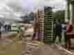 Alors que la nuit était déjà tombée, nous avons finalement décoffré toute la fontaine dans la soirée de vendredi soir. Afin de finaliser la construction, il est nécessaire de couvrir la réalisation en tête car, comme on dit dans le domaine, une construction en terre crue résistera si elle a de bonnes bottes et un bon chapeau.
