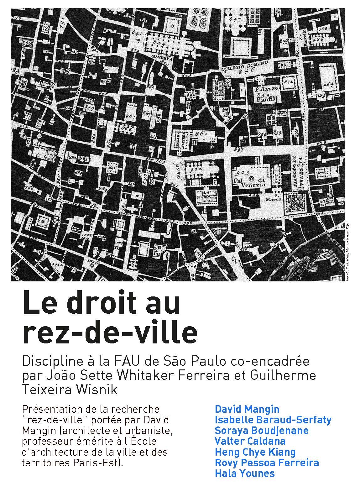 À l’initiative de João Sette Whitaker Ferreira et Guilherme Teixeira Wisnik (FAU-São Paulo), ce séminaire d’échanges internationaux s’intéressera à la recherche sur les rez-de-ville portée par David Mangin depuis 2018. Ces temps d’échanges permettront de rendre compte des avancées réalisées depuis février 2020[^Journée d’échanges internationaux de l’OCS/AUSser, 27 février 2020, Paris. Disponible sur Youtube :