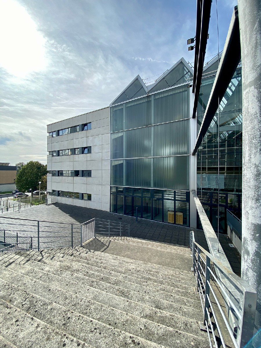 - un atrium avec sa boîte amphi métallique posée sur pilotis