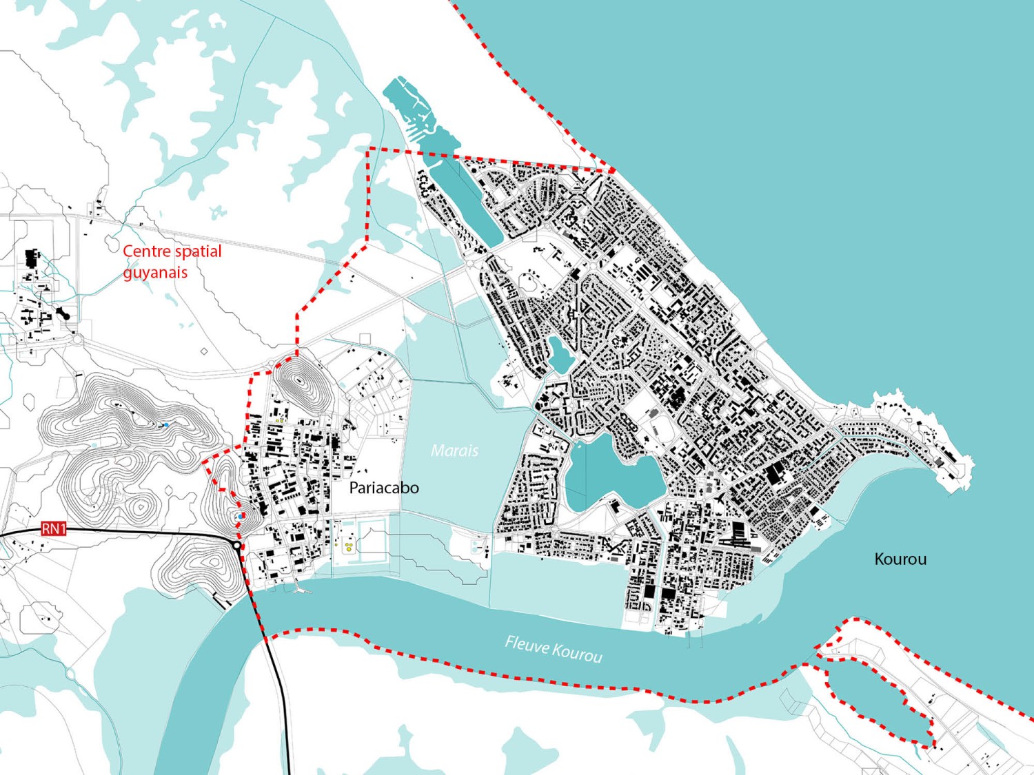 Commandité par la Direction des affaires culturelles de Guyane, ce travail est le dernier d’un cycle de quatre études menées conjointement par le DSA d’architecte urbaniste et le DPEA architecture post-carbone sur le territoire d’outre-mer. Il s’intéresse au développement de la « ville spatiale » de Kourou, quatrième ville la plus peuplée du département. Autrefois développée autour de son bagne, cette cité est aujourd’hui connue pour le Centre spatial guyanais (CSG) implanté dans les années 1960 et qui a été, et est encore, le principal moteur d’expansion de la ville. Cette étude explore de nouvelles façons de développer la ville guyanaise à plusieurs échelles de cadrage, allant de son territoire élargi à l’échelle intime de l’habitat. Elle souhaite redonner une cohérence urbaine globale, et une responsabilité écologique et sociale, à l’expansion de ce que l’on pourrait considérer comme le « satellite », à la fois spatial et fonctionnel du CSG. À la recherche d’une « écomodernité guyanaise » et d’un futur urbain désirable appropriable par tous, la stratégie inscrit l’évolution de la ville à celle de l’ensemble du littoral maritime, s’appuie sur les logiques paysagères présentes, et s’attache à mettre en lien la force de l’intervention institutionnelle et la richesse des habitus locaux