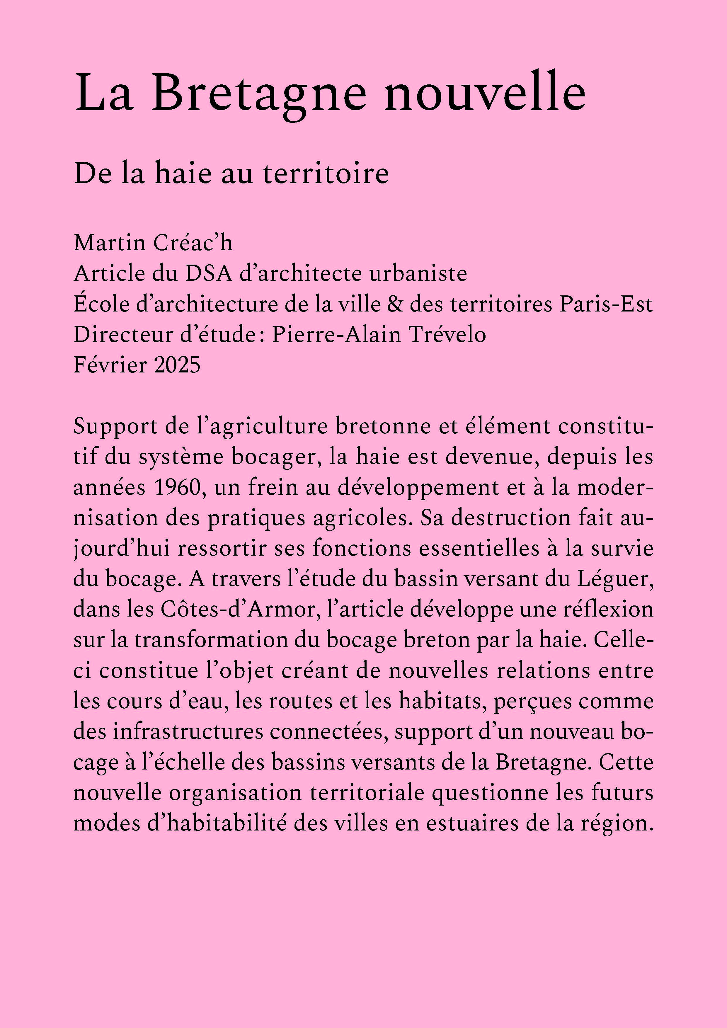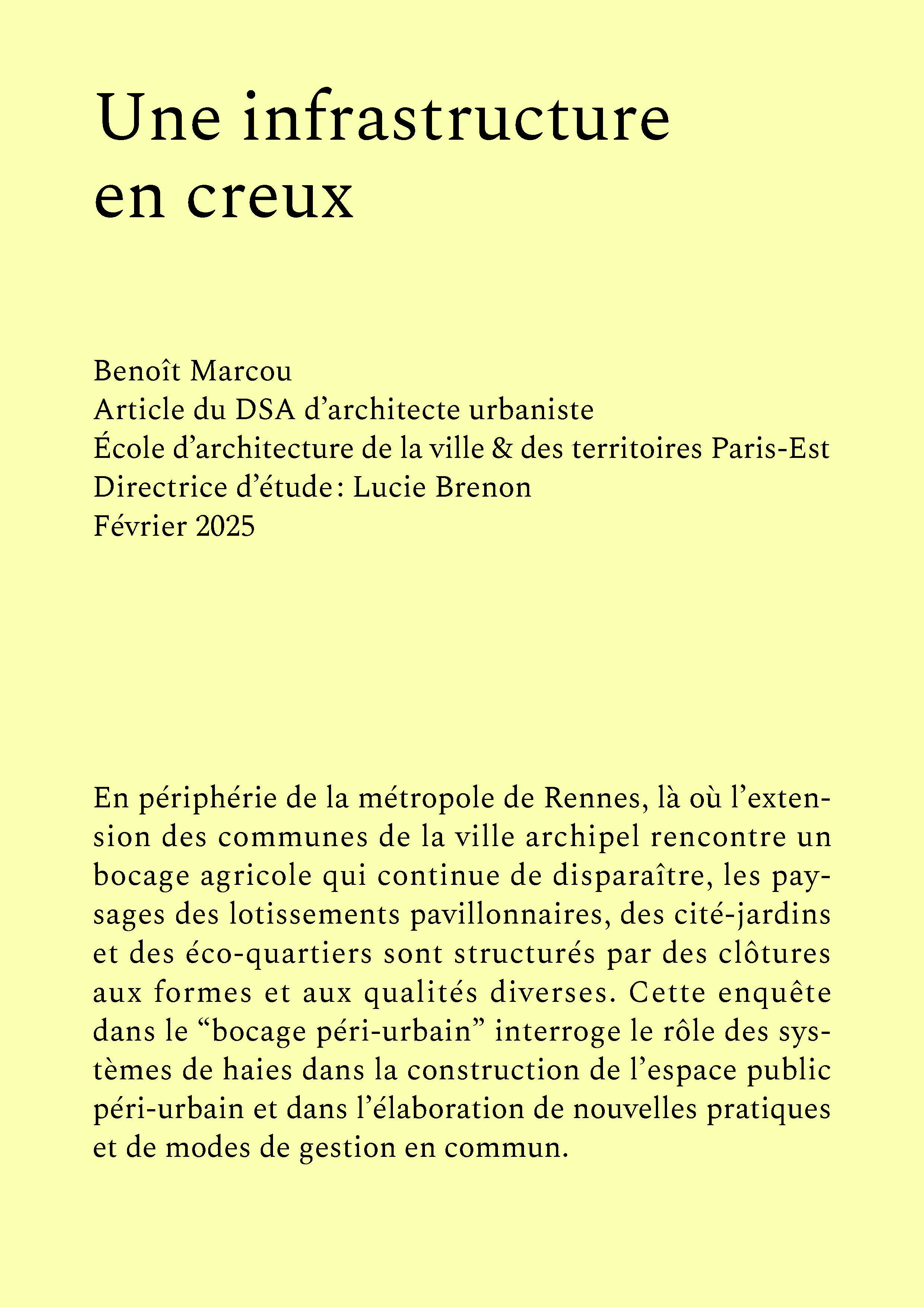 Cette série d’articles a été écrite dans le cadre du séminaire du DSA d’architecte-urbaniste. Cette recherche collective, qui clôture la formation, interroge chaque année un objet terrestre, croisant dynamiques naturelles et transformations humaines. En 2024, notre séminaire a exploré le bocage. Les étudiant.es ont sillonné, scruté, relevé et interrogé ces espaces clos et fragmentaires, découpages de plis et de creux. Cet objet d’étude, qui connaît une actualité autour des controverses sur la simplification de l’espace agricole et des mobilisations pour la sauvegarde et la plantation des haies, est paradoxalement peu regardé par les écoles d’architecture. Notre invitation à s’intéresser au bocage poursuit alors l’objectif de décaler le regard actuellement porté sur ce sujet, pour réfléchir, en architectes des territoires, aux caractères formels, spatiaux et matériels des terrains de bocage, et à leurs enjeux environnementaux comme sociaux.