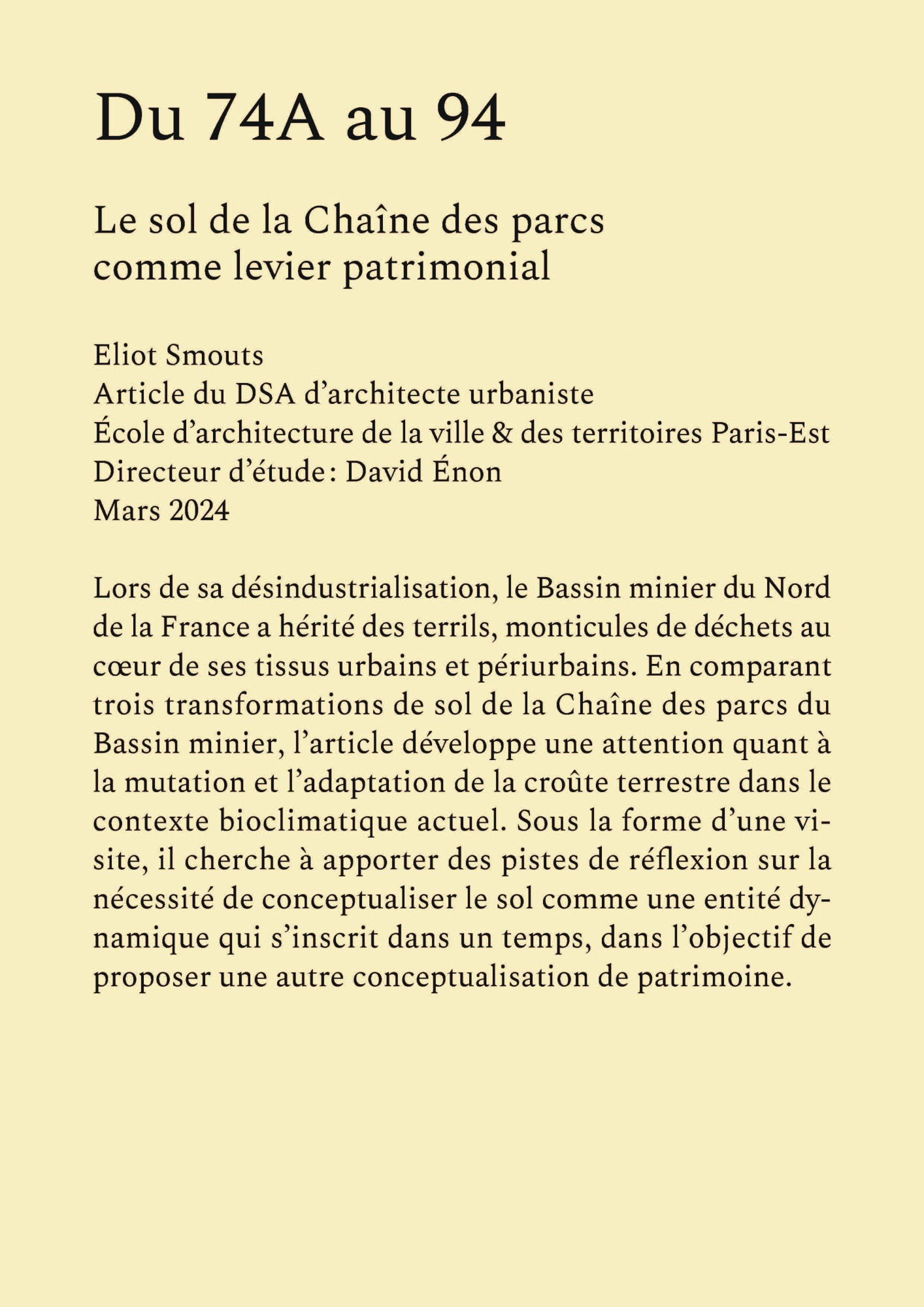 Clôturant cette formation en trois semestres, l’article du DSA d'architecte urbaniste est un travail de réflexivité et de prise de position. Écrit en parallèle d'une mise en situation professionnelle, il est aussi un exercice de transition qui s'inscrit en prolongement des thématiques d'enseignement de la première année et prépare à la pratique professionnelle. En un texte court, structuré, argumenté et illustré, les étudiant·es construisent un propos sur les questions qui traversent le champ de la transformation des territoires : rôles de l'eau et des sols dans l'évolution des territoires, mutation des infrastructures littorales, transformation des zones d'activité ou des sites militaires, enjeux de représentation dans les processus de conception…