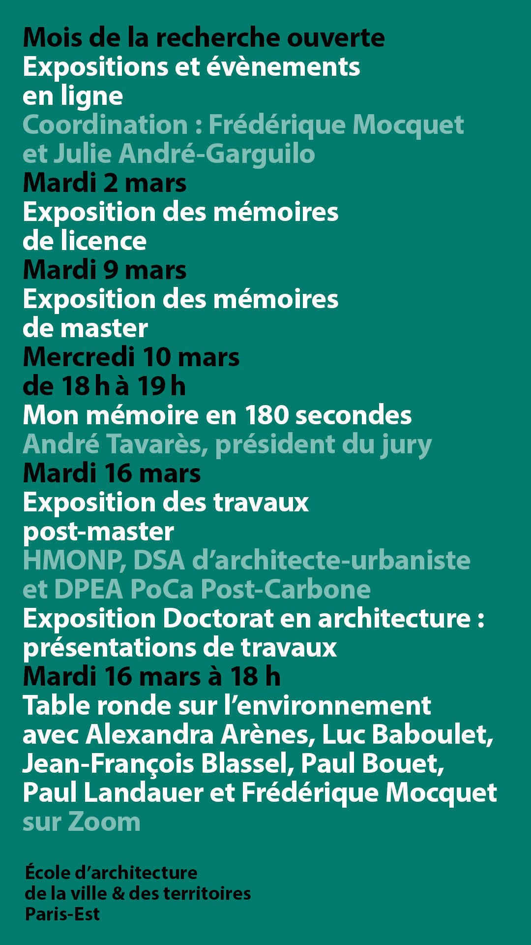 | Mardi 16 mars | Exposition en ligne des travaux Post-master (HMO, DSA d'architecte-urbaniste, DPEA PoCa Post-Carbone). Exposition en ligne Doctorat en architecture : présentation de travaux A partir de 18 h 00 - Table ronde de clôture avec la participation de Luc Baboulet, Jean-François Blassel, Paul Bouet, Paul Landauer et Frédérique Mocquet. |