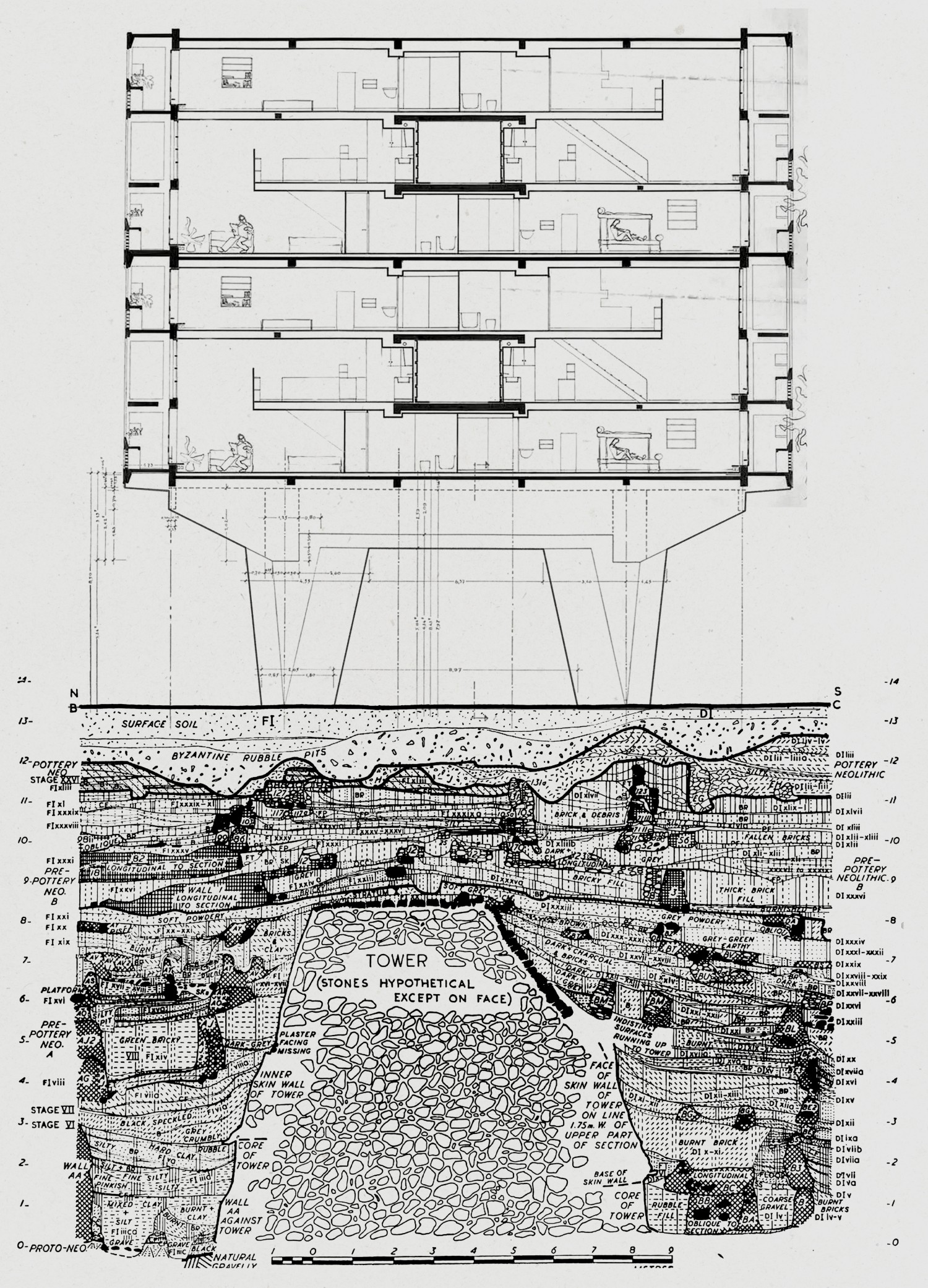 réalisé à partir d'une coupe de la Cité Radieuse , Le Corbusier, 1947, Fondation Le Corbusier et d'une coupe stratigraphique de la tour de Jericho, Kenyon, Excavations at Jericho, t.IV 1981.Pl. 233