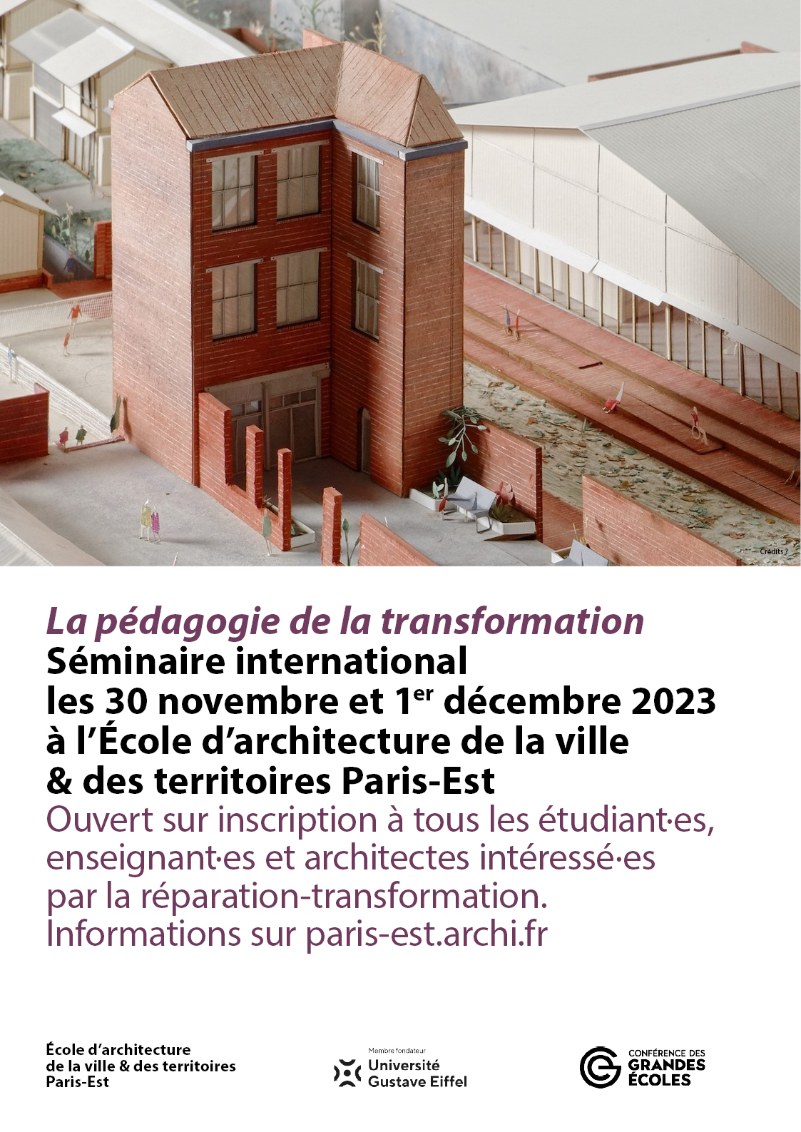 L’impératif de réparation-transformation du cadre bâti guide désormais le travail de multiples instances pédagogiques au sein du monde de l’architecture. Le master « Transformation » de l’École d’architecture de la ville & des territoires Paris-Est, dirigé par Paul Landauer, souhaite partager une réflexion pédagogique avec d’autres écoles d’architecture européennes travaillant sur ce thème. Le séminaire international porte à la fois sur la signification que chacun des programmes de master confère à ce thème (quel rapport au patrimoine, à la construction, au territoire et ses ressources…) et les modalités concrètes qu’il développe pour l’enseigner : type d’approche (historico-théorique, technique…), méthodes d’acquisition des connaissances, stratégies d’enseignement du projet, modes de représentation, etc.