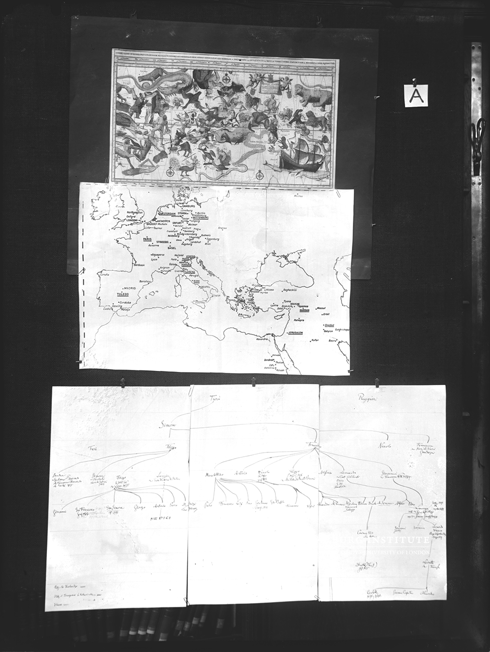 "Panel A". A, Warburg, Bilderatlas Mnemosyne, Photographic reproduction of the original panel, assembled ca. 1926–1929. From A by Warburg, Der Bilderatlas Mnemosyne: Commentary Volume, edited by Martin Warnke, Claudia Brink, and Horst Bredekamp in Berlin: Akademie Verlag, 2000.