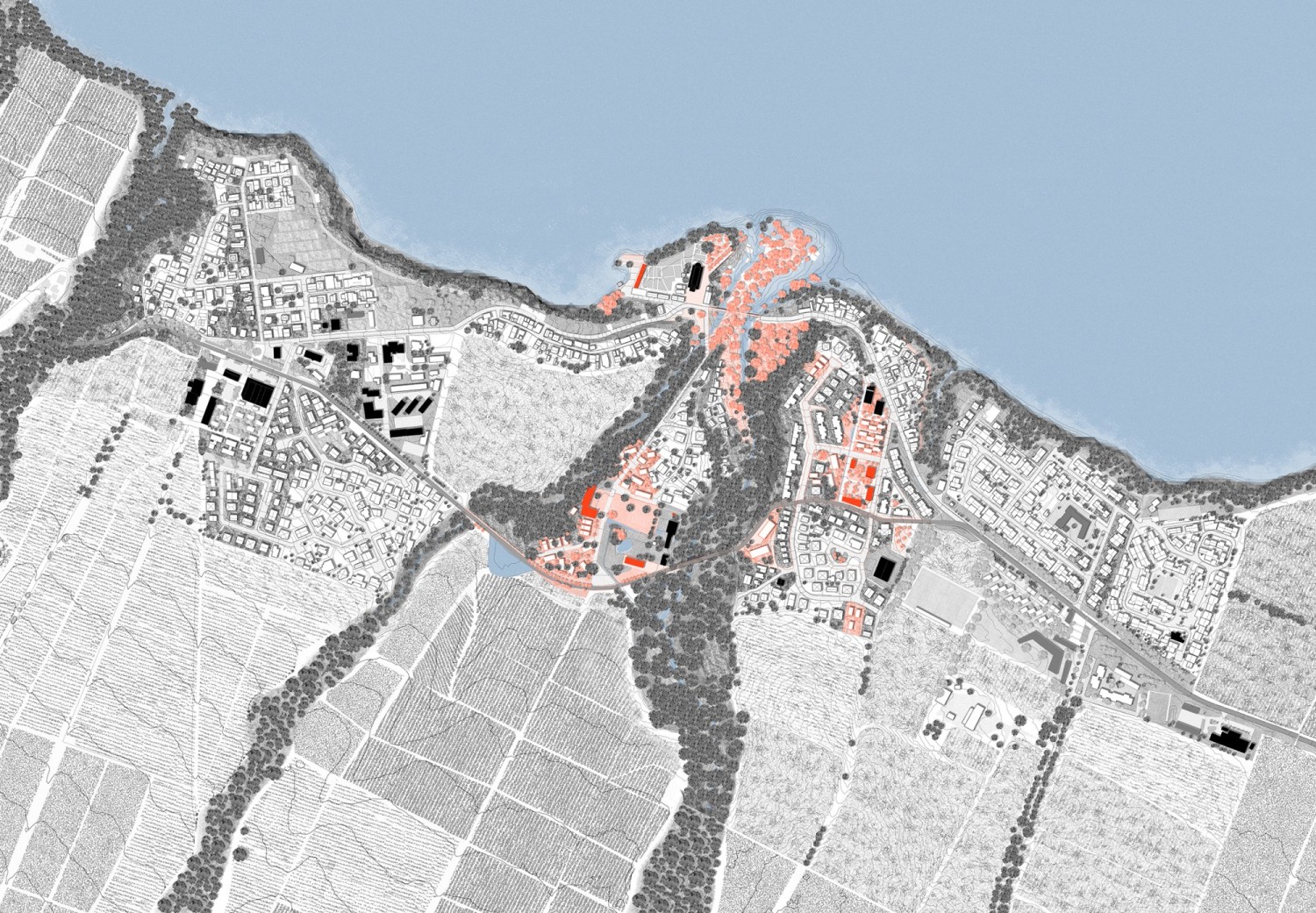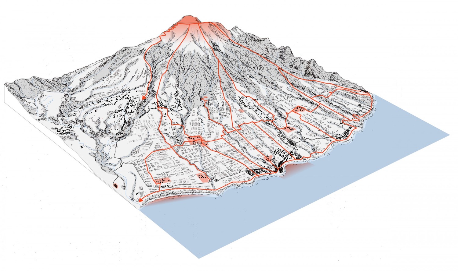 L’enjeu de cette étude est de montrer en quoi une approche transversale, liant la côte à la montagne, peut apporter un double bénéfice : d’une part pour l’adaptation aux risques littoraux, d’autre part pour révéler la richesse du paysage. En décalant le regard par rapport à une approche trop souvent linéaire du littoral, une lecture par séquences inscrites dans la profondeur du territoire est proposée. Il s’agit alors d’engager le processus de relocalisation au sein de quartiers déjà constitués en considérant les espaces agricoles et les ravines comme de véritables atouts. Cette approche esquisse avant tout une nouvelle lecture du bourg, qui le conduit vers un avenir résilient et l’inscrit dans son paysage. à partir de la nouvelle structure du bourg, un maillage de chemins se déploie sur l’ensemble de la planèze agricole. Un réseau de mobilités douces permet de découvrir le riche patrimoine de ce territoire. Habitants et touristes profitent alors de la beauté des paysages qui s’offrent à eux, depuis les vagues puissantes de l’Atlantique jusqu’aux hauteurs mystérieuses de la Pelée.