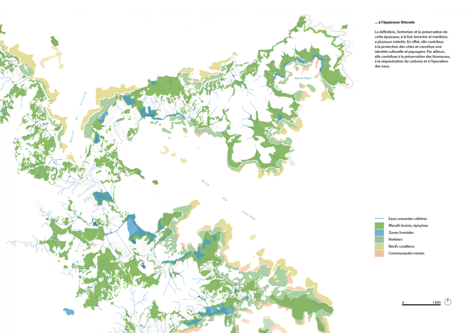 La commune de Trinité est marquée par l’omniprésence de la nature : plages, mornes boisés et mangroves. Dans cet environnement s’insère une structure urbaine organisée par secteurs : ville institutionnelle, bourgs de pêche, zone d’activité, résidences touristiques. Nous voyons là une ville-parc au sein d’une mosaïque de paysages remarquables traversés par des routes panoramiques et des sentiers. Mais la richesse de cette nature est aussi d’une brutalité intense. Soumise aux intempéries propres aux climats subtropicaux, la commune de Trinité doit pouvoir adapter sa forme urbaine à ces contraintes. De plus, les fronts de mer perturbent les équilibres majeurs des milieux côtiers en bloquant leurs mouvements. Cette étude envisage donc de restituer une épaisseur littorale naturelle, d’amorcer une dédensification progressive, dans une perspective de retour à un état plus naturel sous forme d’un sentier littoral actif.