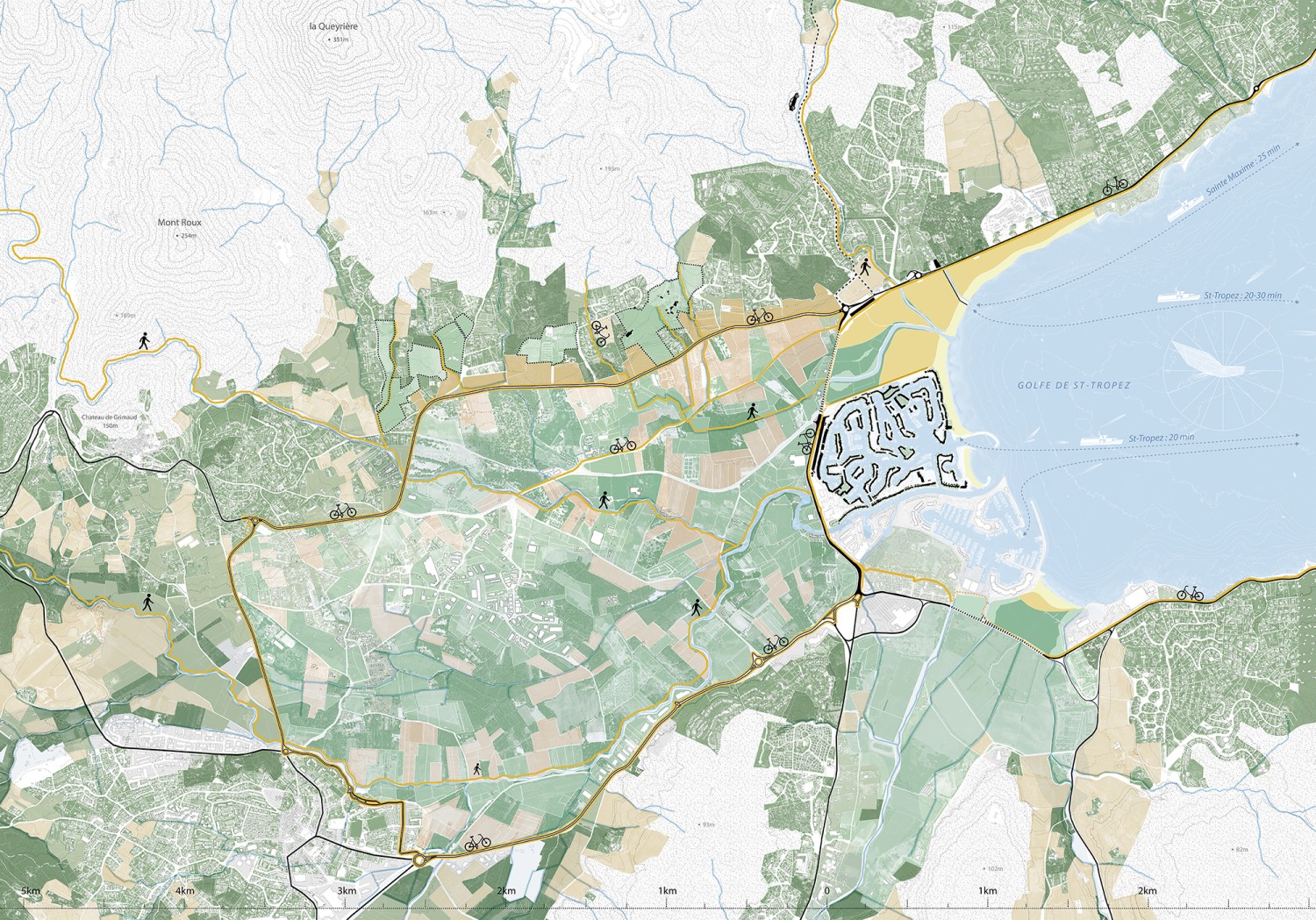 Situé au fond du golfe de Saint-Tropez, le littoral de la commune de Grimaud a été urbanisé tardivement. Dans les années 1960, les terres marécageuses de l’estuaire de la Giscle attirent l’attention de l’architecte François Spoerry. Ce dernier, également marin, en fait l’acquisition dans le but d’y bâtir une cité lacustre : Port Grimaud. Dès lors, la côte maritime connaît une mutation rapide autour d’un tourisme alliant pratiques balnéaires et navigation de plaisance. Sur-aménagé, le littoral présente désormais d’importants dysfonctionnements écologiques et urbains. Le changement climatique, en cause dans la hausse du niveau marin, amplifie les risques liés à la submersion, à l’érosion et aux crues. Dans une situation critique, le littoral de Grimaud n’a plus la capacité de s’adapter naturellement. Son patrimoine sédimentaire et architectural est en péril. Au-delà des risques menaçant ses habitants, le tourisme, principale ressource économique du territoire, est fragilisé. Cette étude entend développer une stratégie pour accompagner ces mutations d’ici à l’horizon 2100. Son objectif est de permettre au territoire de composer avec les aléas naturels. L’adaptation aux dynamiques liées à l’eau est un levier de projet. Le territoire pourrait ainsi retrouver ses valeurs sociales et écologiques, celles-ci ayant été négligées au cours des dernières décennies. La proposition se fonde sur le retrait, la transparence hydraulique et la valorisation de la cité lacustre pour constituer un littoral inscrit dans toute l’épaisseur du territoire. Cet objectif ne peut être atteint qu’à travers une transition impliquant des étapes intermédiaires. Par son évolution, le paysage grimaudois propose un nouveau genre de tourisme et accepte les effets du changement climatique.Commanditaires de l’étude
