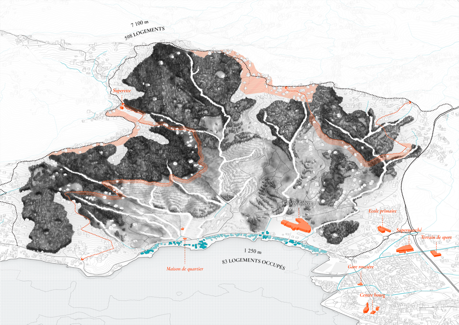 La commune du Robert, se déployant entièrement autour de sa baie, a connu une urbanisation récente majoritairement orientée vers le littoral. Cette situation a priori privilégiée se révèle toutefois être un lieu de concentration des aléas et des dynamiques naturelles liées à l’eau et au sol. Il semble aujourd’hui difficile de concilier un développement urbain littoral tout en garantissant la sécurité à long terme des populations exposées aux aléas naturels. Au-delà des risques pour l’homme, l’urbanisation de la commune du Robert entraîne aujourd’hui une pression importante sur le milieu fragile de la baie, véritable support de vie et d’activité pour la commune. En effet, l’urbanisation du fond de baie a progressivement canalisé, parfois obstrué, les embouchures des différentes rivières qui se jettent dans la baie. Si ce milieu entre terre et mer est particulièrement riche et attractif, il est aussi très vulnérable. La proposition envisagée pour répondre à cette étude est la suivante : assurer les continuités écologiques entre rivières et baie tout en accompagnant le déplacement des populations menacées le long des lisières bordant chaque bassin versant. En privilégiant une lecture attentive du territoire, de sa géographie, de ses paysages, de ses habitats, l’étude entrevoit dans la question des risques l’opportunité de remettre l’eau au centre de tous les regards. Face aux difficultés liées à la question de la relocalisation des personnes exposées aux aléas naturels, à court comme à long terme, nous avons souhaité apporter des réponses qui s’inscrivent dans les manières si particulières d’habiter la baie du Robert ; en permettre la perpétuation tout en accompagnant leur métamorphose patiente.