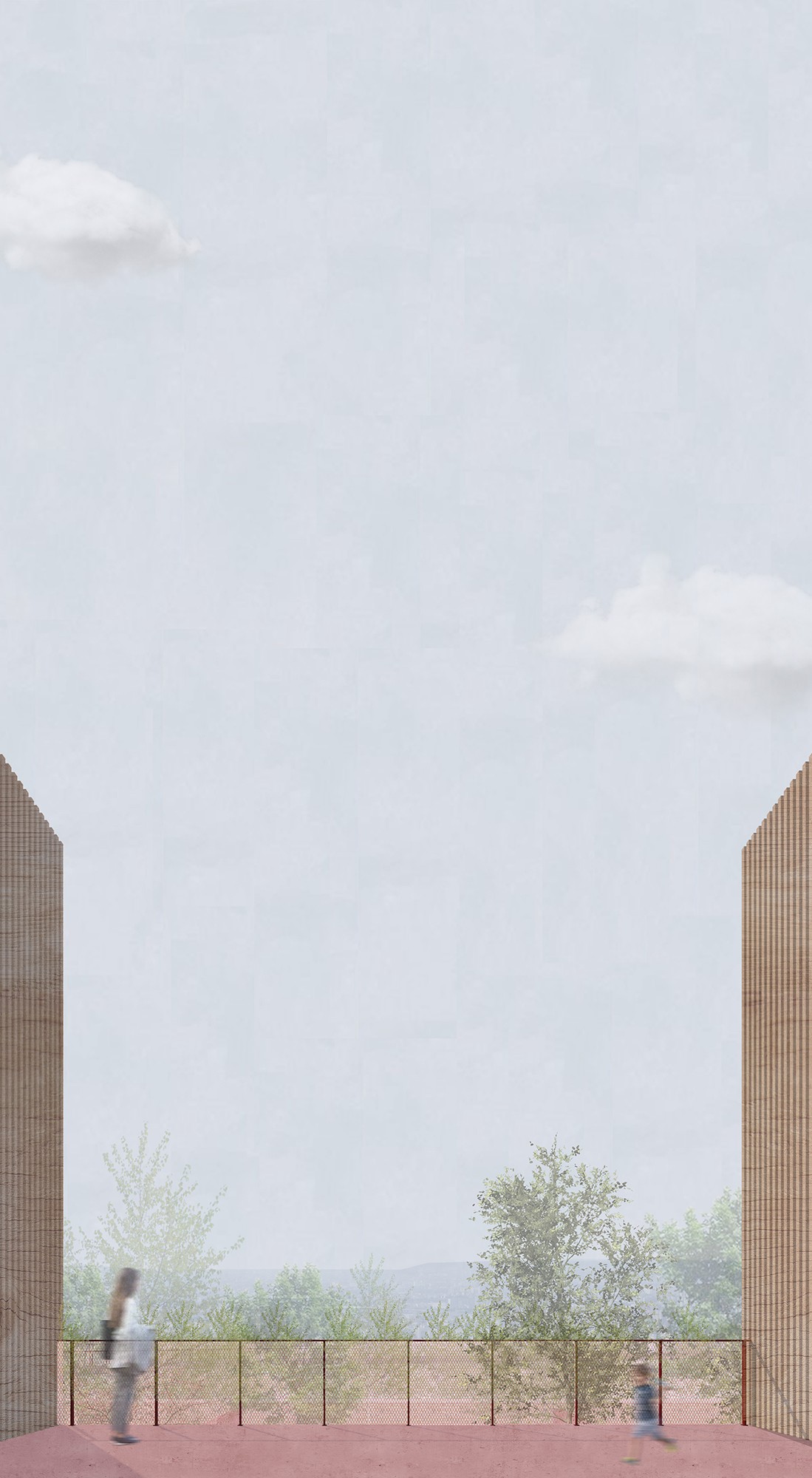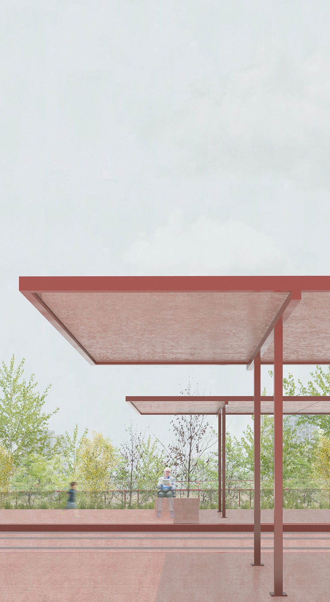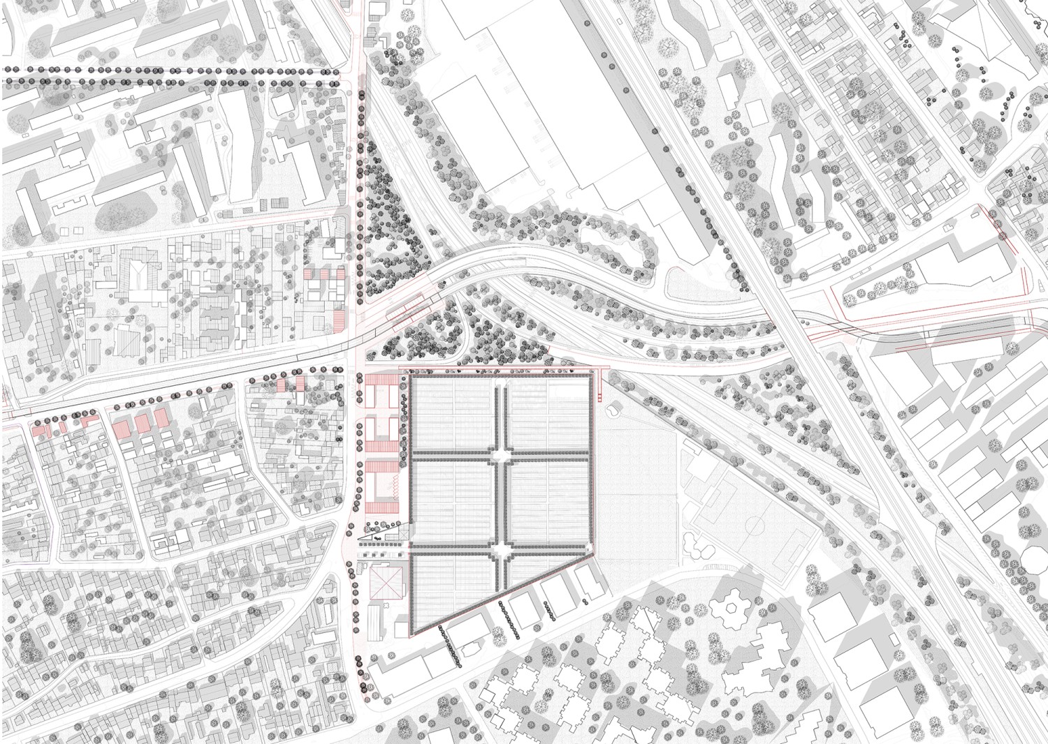 Infrastructure de mobilité majeure, le tramway T1 sera prochainement prolongé vers l’Est francilien. De Noisy-le-Sec, il rejoindra Val de Fontenay, pôle métropolitain en pleine intensification aménagé par la SPL Marne au bois. C’est aux abords et dans le prolongement de cette étude qu’elle souhaite penser l’aménagement de l’arrêt Victor Hugo et d’en comprendre ses enjeux. Située sur l’actuel rond-point de l’avenue Victor Hugo au bord de l’autoroute A86 et à la rencontre de trois communes, Montreuil, Rosny-sous-Bois et Fontenay-sous-Bois, sa situation particulière au cœur d’un site de confins rend cet arrêt singulier. L’arrivée de cette nouvelle mobilité est alors l’opportunité d’explorer le rôle que peut tenir ce site dans la métropolisation contemporaine de l’Est parisien, autant à l’échelle territoriale qu’implique le tramway qu’à l’échelle locale qu’implique son arrêt. Cette étude est l’occasion de réévaluer les relations de synergie entre des grands pôles de mobilités tel que Val de Fontenay et des arrêts secondaires qui composent le maillage dense des transports publics du Grand Paris. A partir de l’objectif de la commande d’explorer les devenirs de l’arrêt de tramway Victor Hugo le projet développe deux intentions : d’une part proposer une alternative à la densification et la valorisation foncière qui sont à l’œuvre aux abords des arrêts de transport public, d’autre part, de considérer la ligne de tramway comme un levier pour l’aménagement de l’espace public avoisinant, offrant un espace ouvert salutaire en marge des grandes polarités métropolitaines.