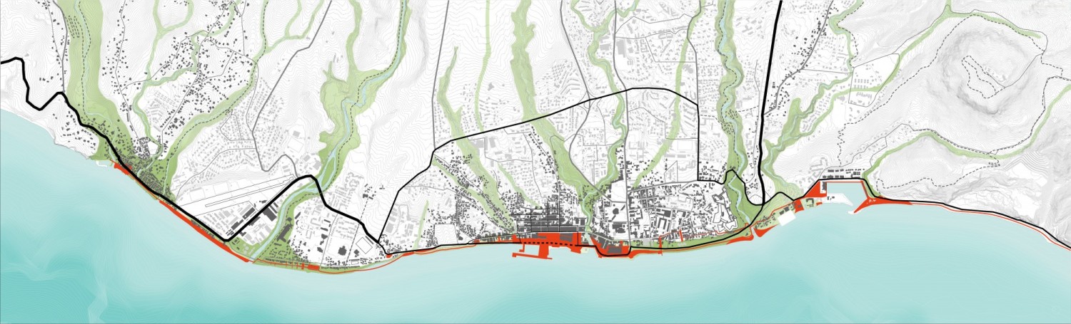En Guadeloupe, face à la mer des Antilles, les villes de Baillif, Basse-Terre et Gourbeyre sont coupées de leur rivage par de grandes infrastructures héritées des aménagements du XXe siècle. Le front de mer se résume à la route littorale et aux enrochements. Coincée entre une voie rapide et un rivage presque entièrement artificialisé, la promenade de bord de mer est aujourd’hui délaissée par les touristes comme par les habitants qui ont fini par « tourner le dos à la mer ». Commanditée par ces trois communes ainsi que par la DEAL de Guadeloupe, cette étude cherche à rendre à la ville son littoral et à transformer l’image de sa façade maritime. Le défi du projet réside dans sa capacité à associer enjeux territoriaux et locaux, logiques de flux et logiques d’usage, au sein d’un aménagement littoral unificateur. La bande côtière des communes littorales françaises, et a fortiori dans les îles volcaniques, est très contrainte. Elle demeure cependant l’espace d’articulation privilégié des différentes pièces urbaines et paysagères qui composent le littoral. Au sein d’un territoire morcelé, entrecoupé par les ravines et les routes, cette propriété devient essentielle. En prenant appui sur les tissus urbains, la géographie et les infrastructures, l’étude propose une manière de reconstruire une continuité littorale et tente de réconcilier les villes avec leur rivage.