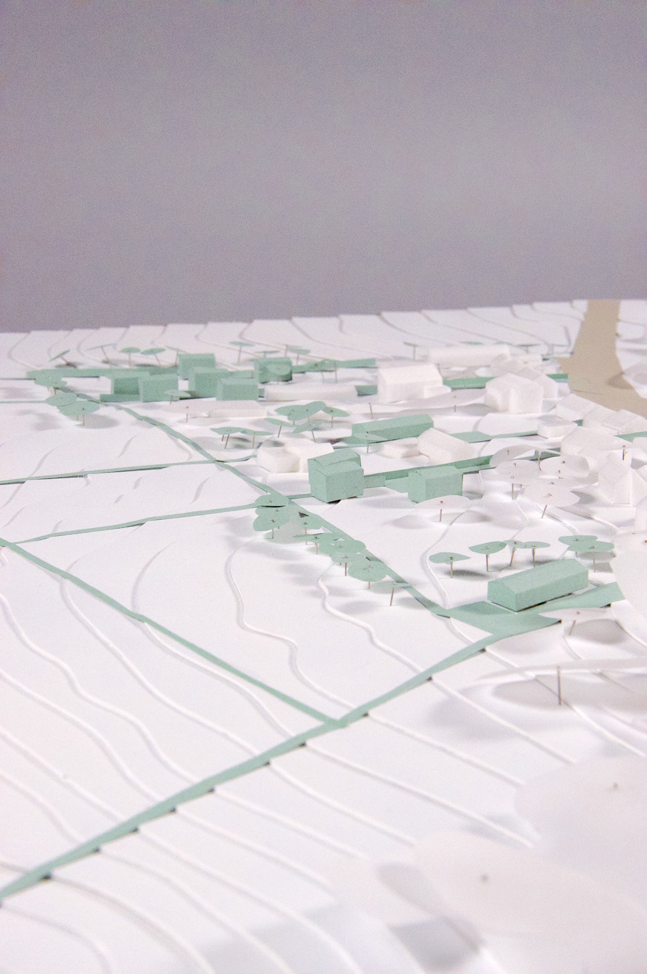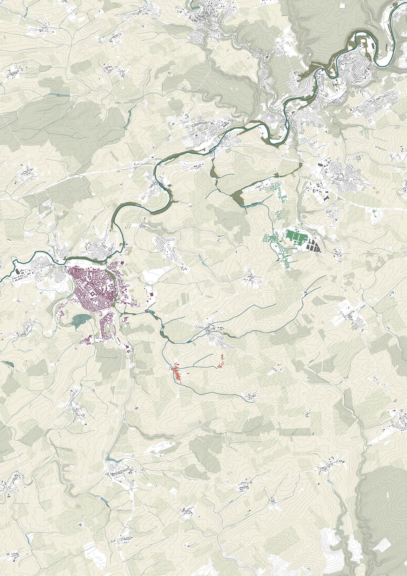 Les prises de conscience successives sur la crise climatique, l’effondrement de la biodiversité, ainsi que la raréfaction des ressources, nous conduisent à encourager des démarches de sobriété. En 2021, la Loi Climat et Résilience qui affirme l’objectif du Zéro Artificialisation Nette (ZAN) a vu le jour. Les principes d’aménagement doivent mettre fin à l’étalement urbain, identifié comme un modèle de développement qui engendre une surenchère de consommation foncière et de matière. Pour les quarante-et-une communes d’Orne Lorraine Confluences, en Meurthe-et-Moselle, la prise en compte du ZAN remet le Plan Local d’Urbanisme intercommunal et Habitat (PLUiH) en travaux, pour reconsidérer la destination des sols et la prospective territoriale. La présente étude observe trois typologies de communes représentatives du territoire d’Orne Lorraine Confluences : Bruville, le village-rue lorrain ; Batilly, le chapelet d’habitations marqué par l’industrie automobile ; Jarny, la ville contrainte par ses infrastructures et son histoire minière. Chaque situation est traitée comme un laboratoire et propose des réponses complémentaires d’habiter qui réconcilient désirabilité et sobriété. Ensemble, elles forment un maillage de petites centralités. Les ruisseaux deviennent chemins, les routes deviennent communs.