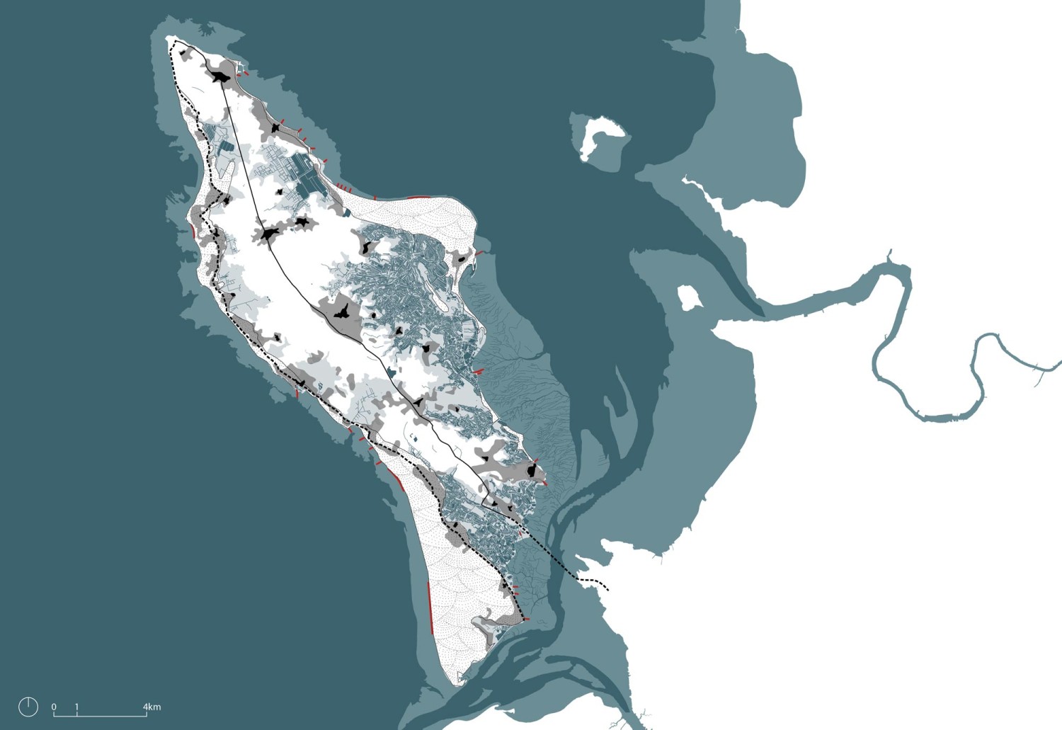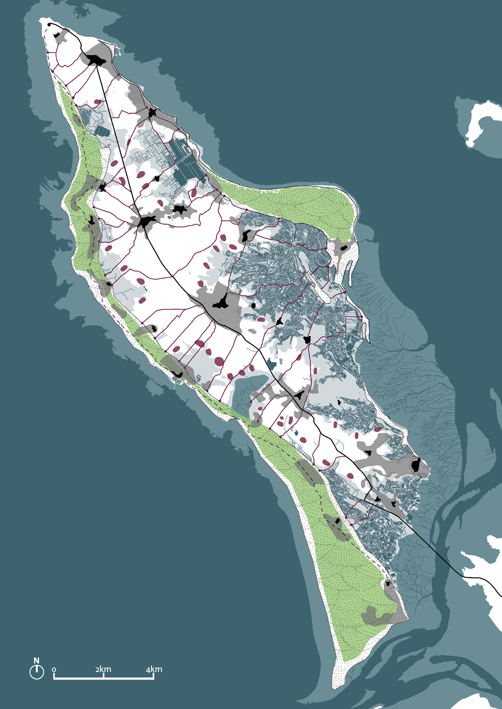 Deux scénarios prospectifs prolongent cet historique et s’interrogent sur les conséquences et la possibilité de deux attitudes radicales : ne rien faire ou se replier dans l’urgence. Nous proposons ensuite une troisième attitude, qui vise à anticiper sans tarder les changements provoqués par la montée des eaux et l’aléa de submersion, tout en mettant en oeuvre une adaptation graduelle sur le long terme. La stratégie qui en découle articule la mise en place d’une politique de relocalisation des habitations et activités menacées, la reconfiguration des infrastructures de mobilité, et la reformation du cordon dunaire, seul élément à même de faire rempart à l’eau.