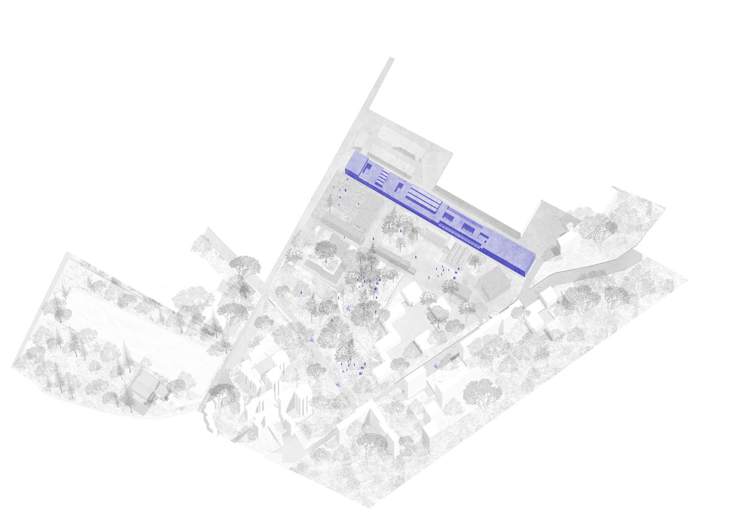 Si Satory Ouest se prépare à l’arrivée du Grand Paris Express, Satory Est reste un camp militaire de première importance. Paysage de pouvoir façonné en contrepoint du château de Versailles, il abrite des bureaux stratégiques, des équipements industriels et des quartiers résidentiels sur un plateau délimité par des infrastructures végétales et ferroviaires. Le métro vient bouleverser l’équilibre de cet îlot discret et pousse l’armée à repenser son occupation des lieux. En dessinant finement les limites de chaque domaine, l’étude s’attache à réinterroger la frontière en tant qu’interface habitée.