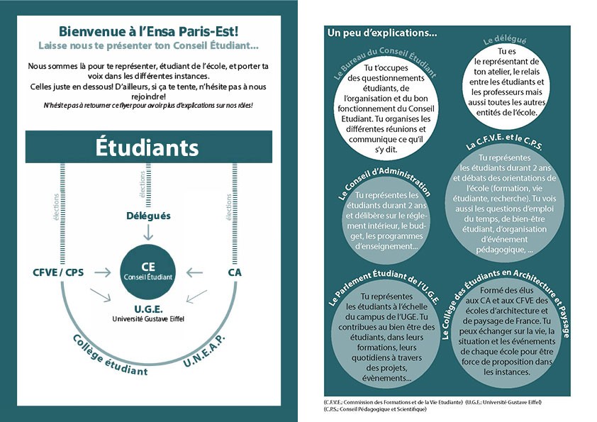Entité centrale de la représentation des étudiants de l’École, le Conseil étudiant a pour objectif principal de faire le lien entre les étudiants, l’administration et les enseignants de l’école. Il se compose d’étudiants délégués et d’étudiants élus aux instances. Cette pluralité de membres lui permet de travailler à toutes les échelles, avec les instances de l’École, de l’université et d’autres organisations à l’échelle nationale. Dans le but d’améliorer les conditions de formation et de vie étudiante, il est à l’écoute des étudiants de l’École, produit des sondages, recueille l’avis du plus grand nombre. Cela lui permet ainsi d’être une force de proposition forte et constructive. Le Conseil étudiant est aussi un élément actif de la vie de l’École, de par son soutien aux différents évènements qui ont lieu à l’Ensa Paris-Est.
