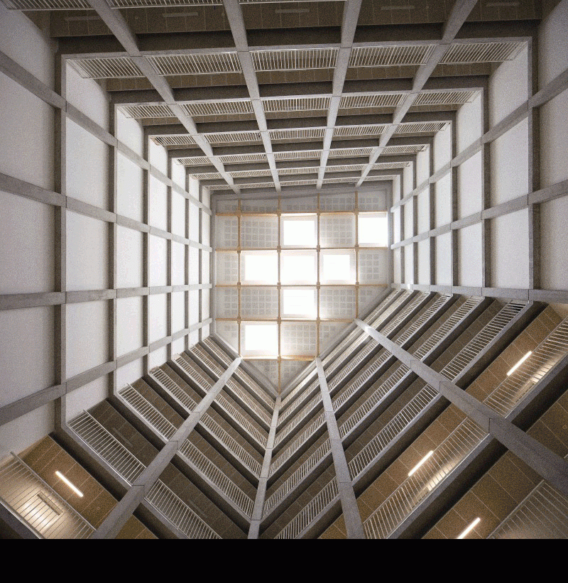 La résidence étudiante de l’école a été conçue par l’Atelier Villemard Associés selon un plan très original et inédit : des logements autour d’un atrium bioclimatique, ventilé sur 9 étages, desservis par des coursives intérieures. Il s’agit d’un bâtiment bas carbone bois/béton.